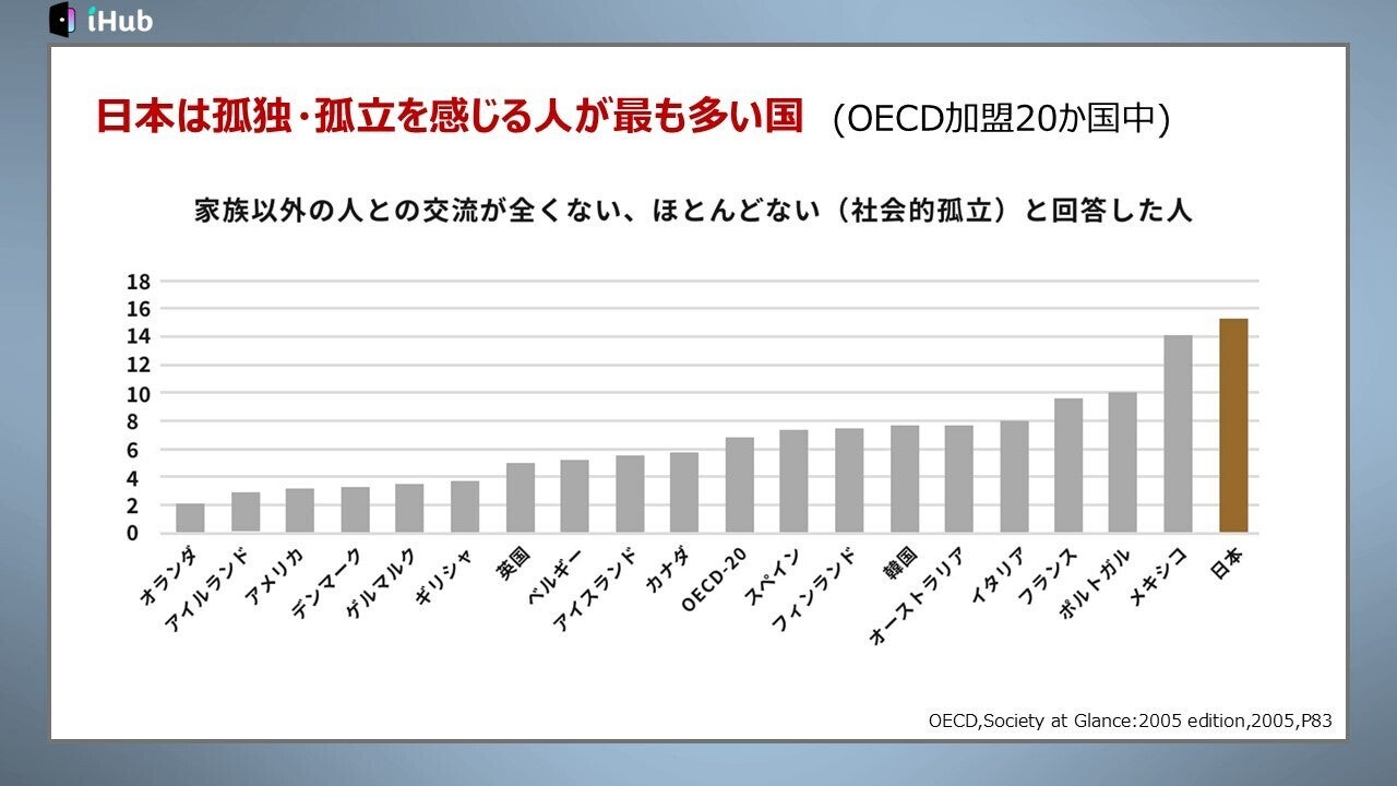 日本における孤独・孤立の実情については、いくつかの調査や研究が進められています。OECDの調査によれば、加盟20か国中、日本は孤独・孤立を感じる人が最も多い国とされています。(*1)