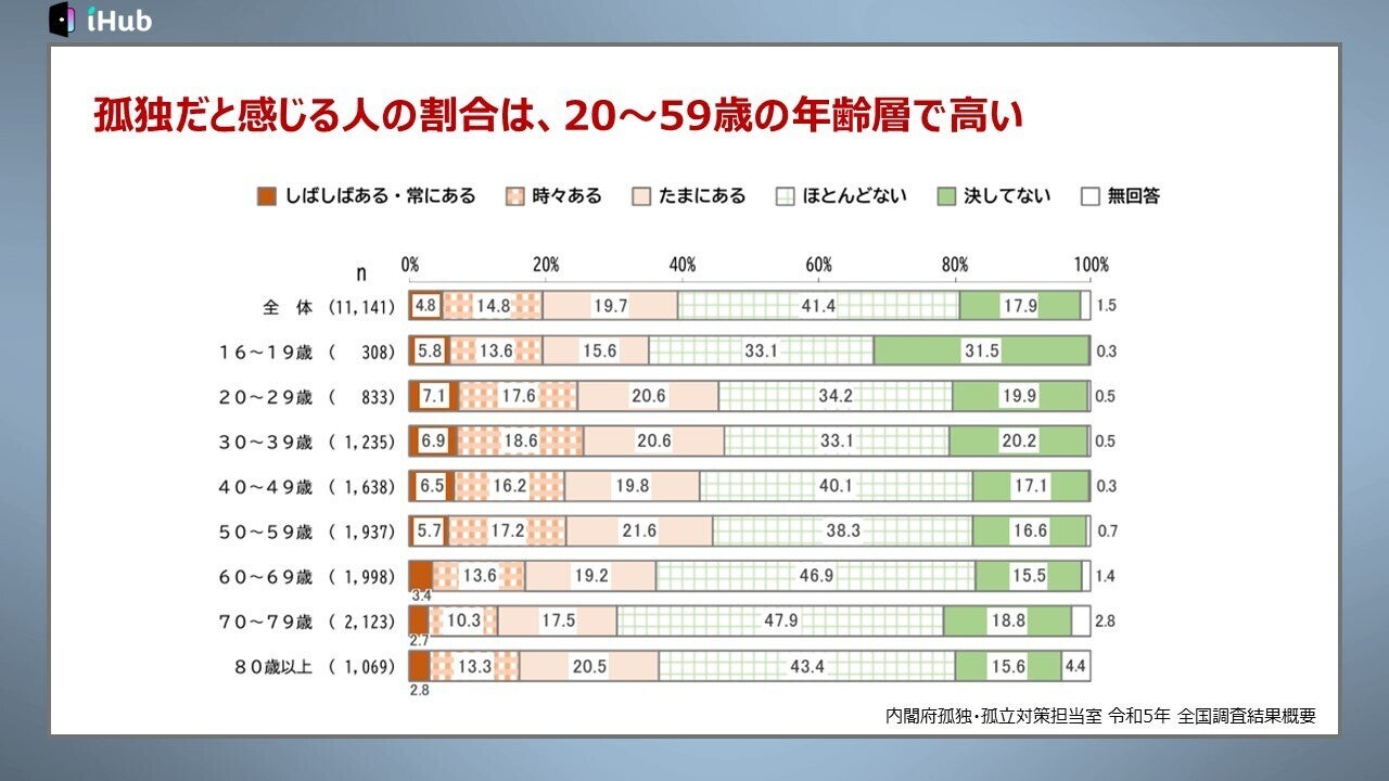 コンテンツや価値観の多様化、テクノロジーの発展により、私たちは一人でも生活できる自由を手に入れました。お金とインターネットさえあれば、人と会わずに生きることも可能です。しかし、その「便利な」生活の代償として、家族や地域、職場でのつながりが希薄化し、孤独感が高まっています。これにより、身体的・精神的な影響が広がり、さらには「闇バイト」などの犯罪に巻き込まれる人も増え、孤独が社会的なリスクにもなりつつあるのです。