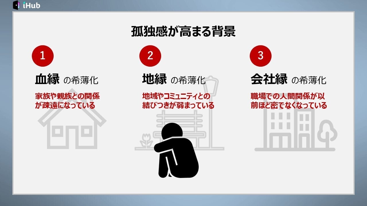 孤独感が高まる背景には、3つの「縁」(血縁・地縁・会社縁)の希薄化があると考えています。