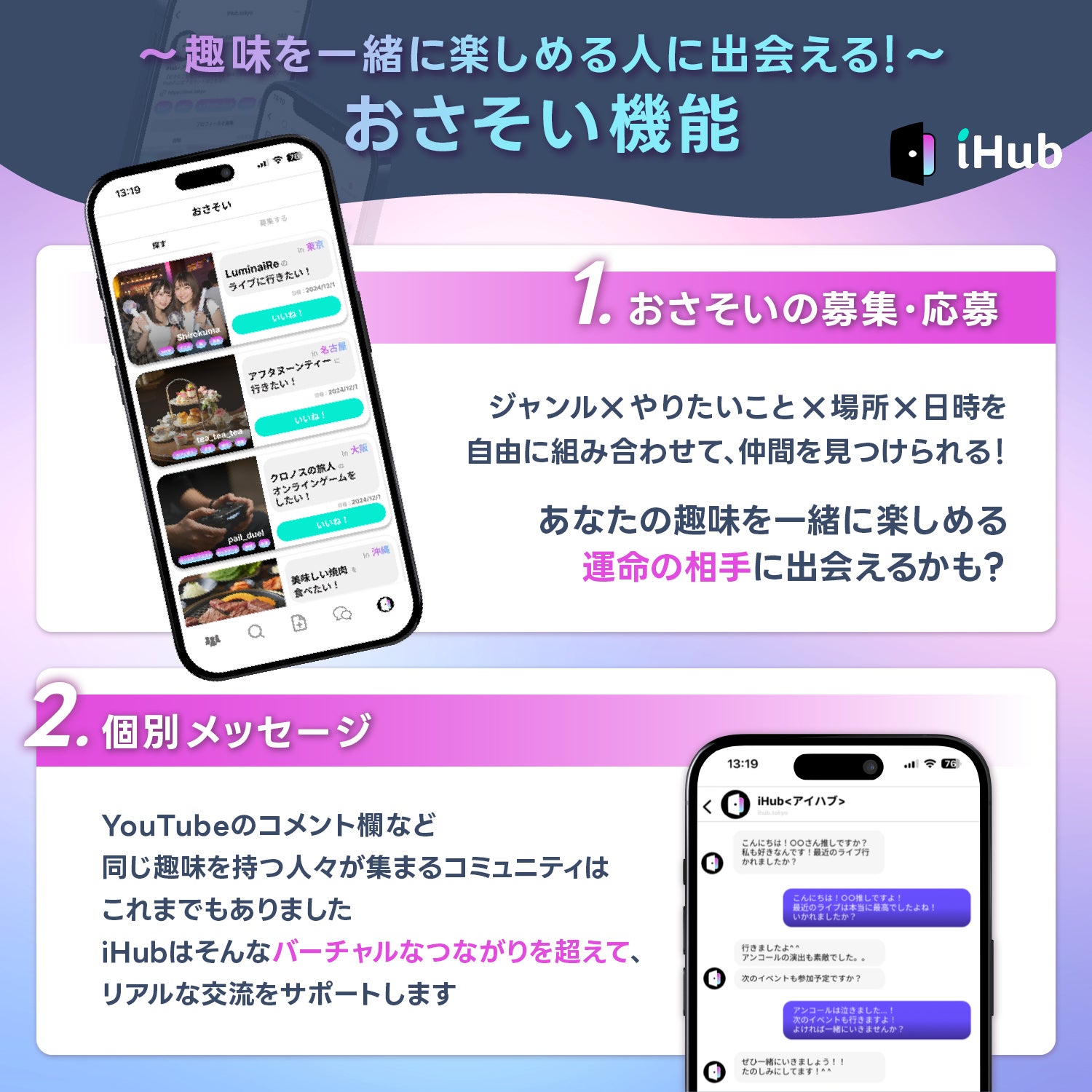 私自身、マイノリティな趣味を持っていたために友達を見つけにくい経験をしてきました。YouTubeのコメント欄の向こうにいる誰かと話したい、でもSNSではなかなか見つからない。そんな寂しさを感じていたからこそ、『iHub』は常にユーザーにとって本当に価値があるものを提供することを大切にしています。