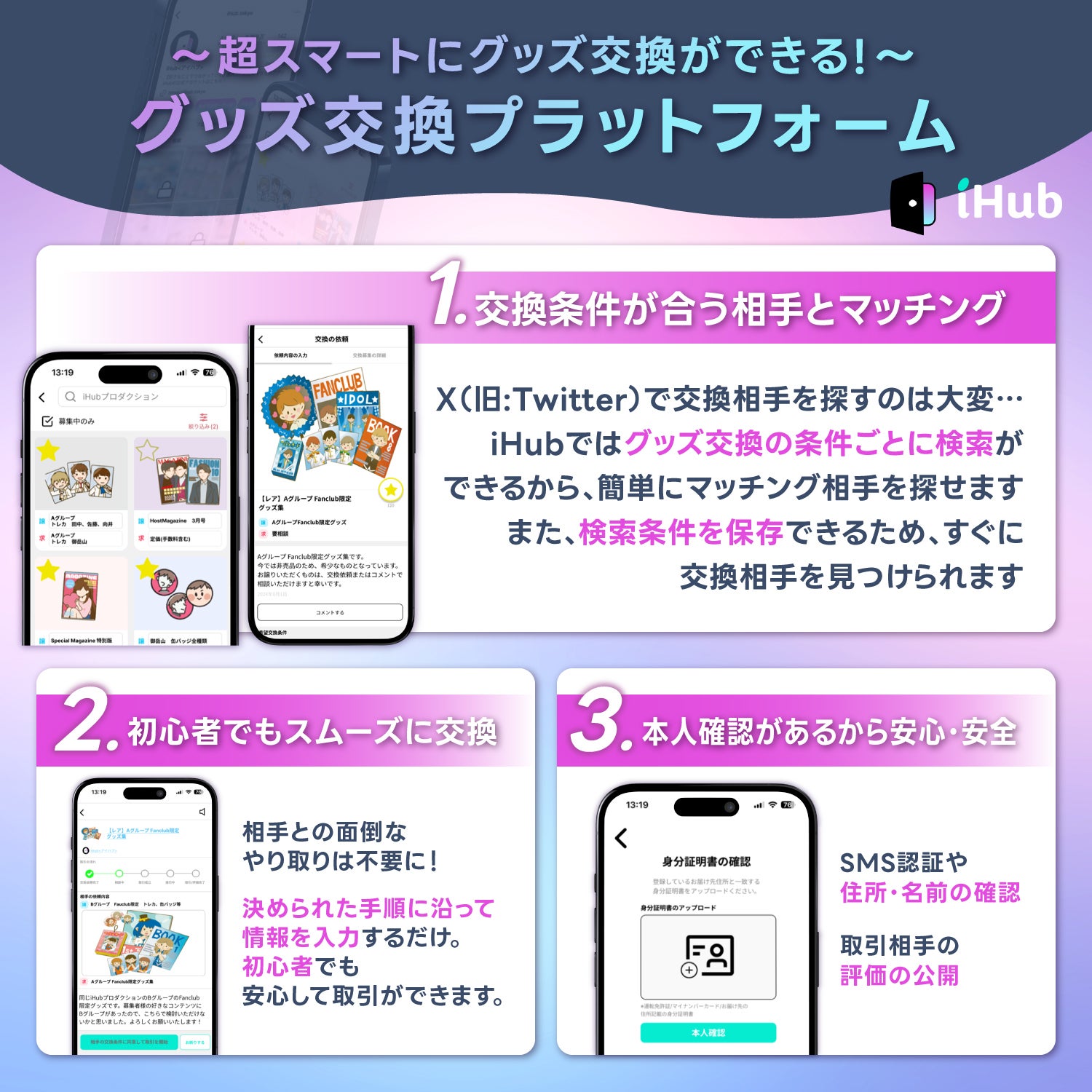 X(旧:Twitter)で交換相手を探すのは大変・・・。『iHub』ではグッズ交換の条件ごとに検索できるから、最適な交換相手をかんたんに見つけられます!