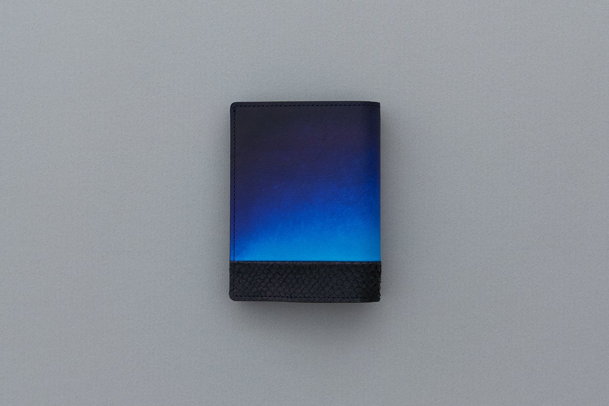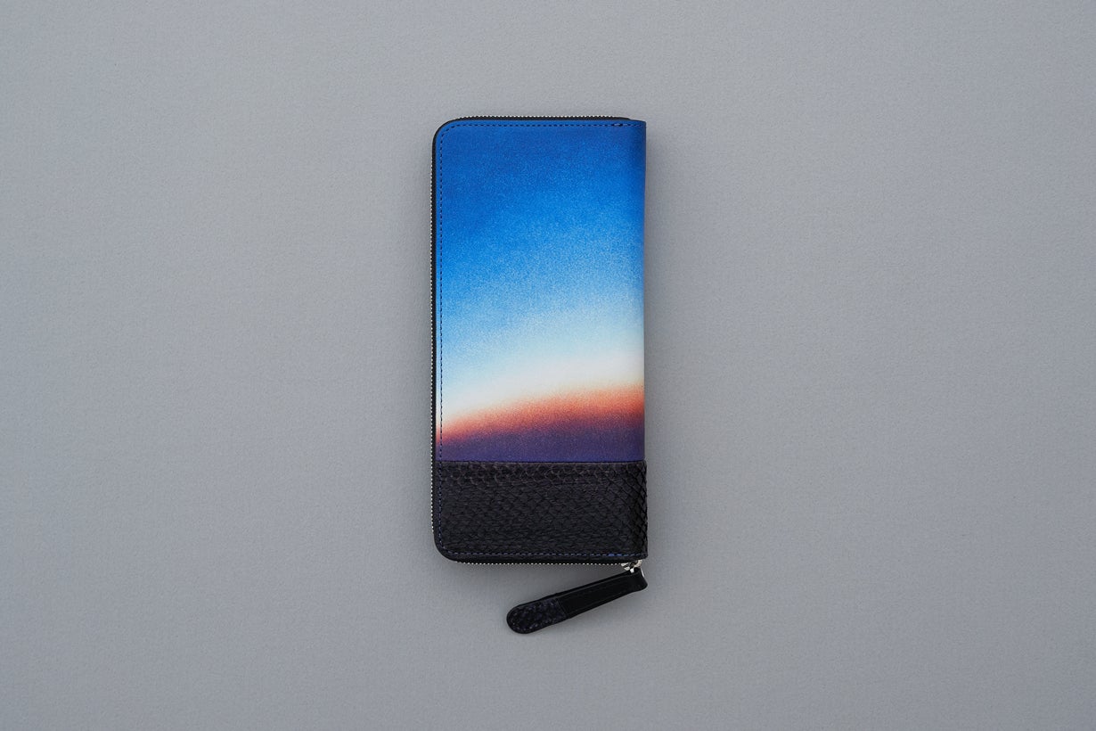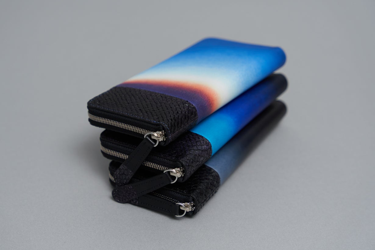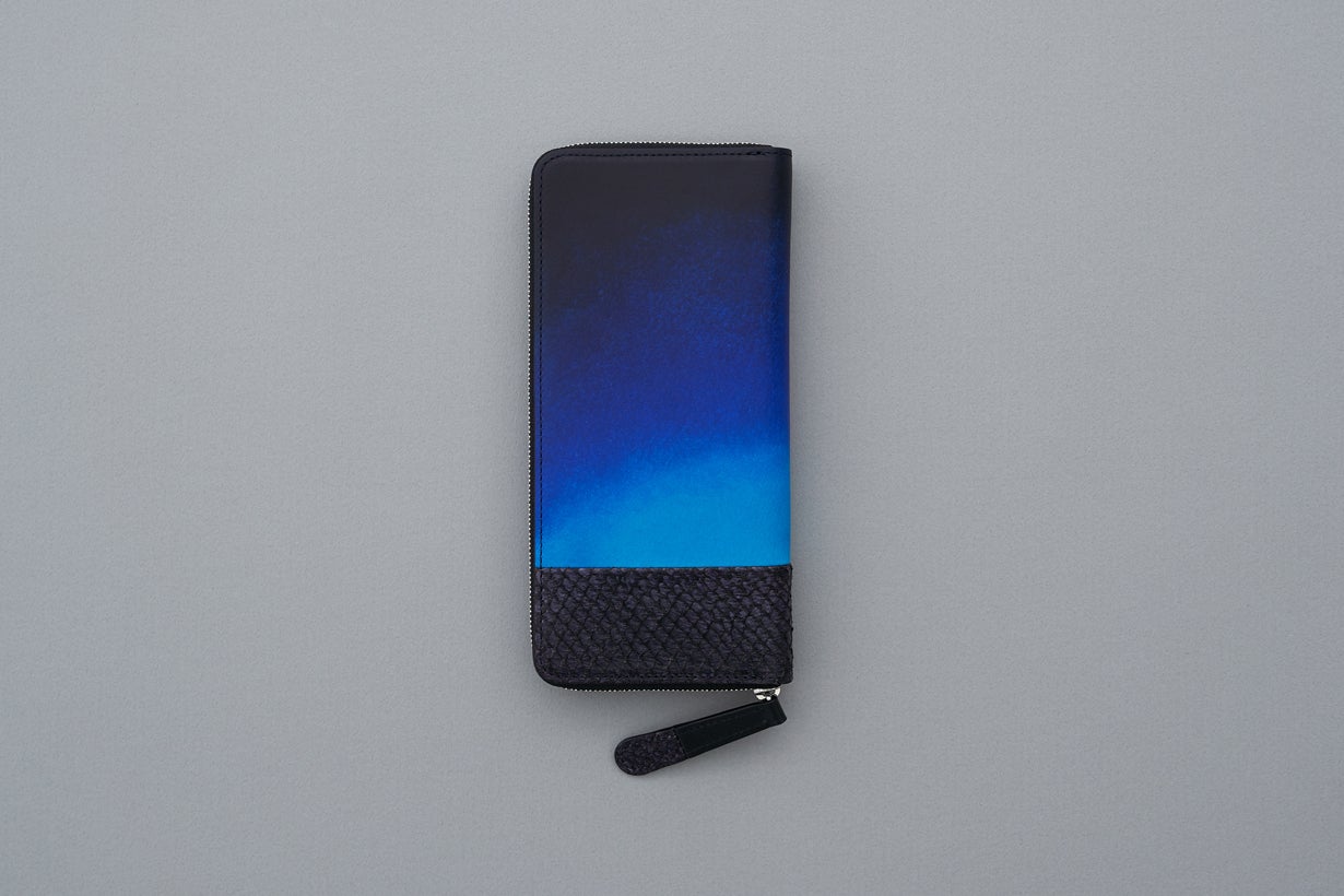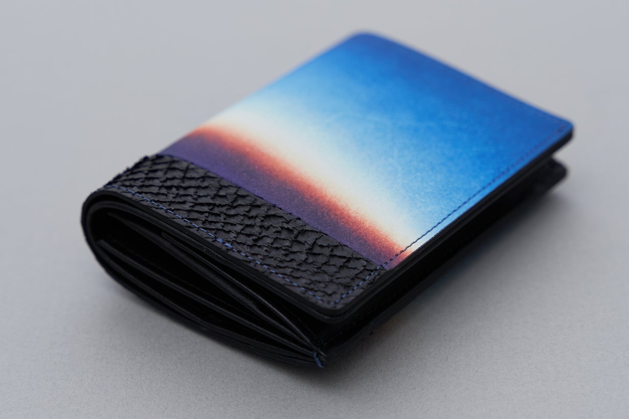 フィッシュレザーの鱗模様を「海の波」に見立て、グラデーションレザーを「変わりゆく空」に見立て、美しい風景をそのままお財布に。
