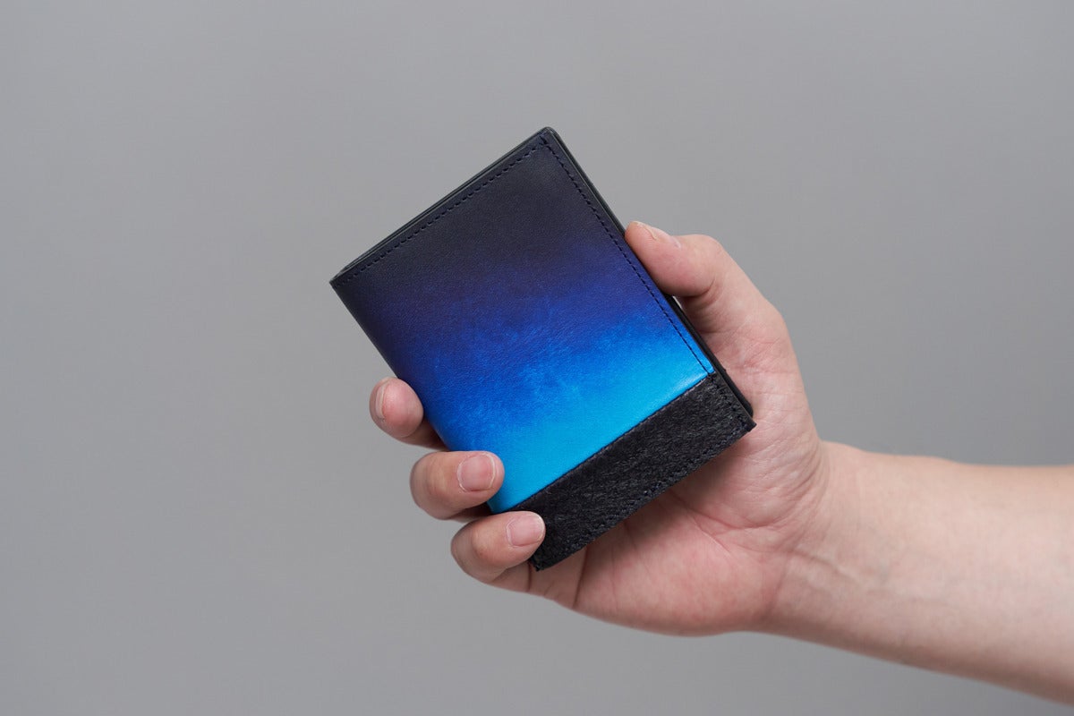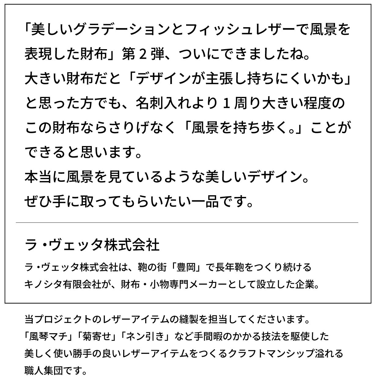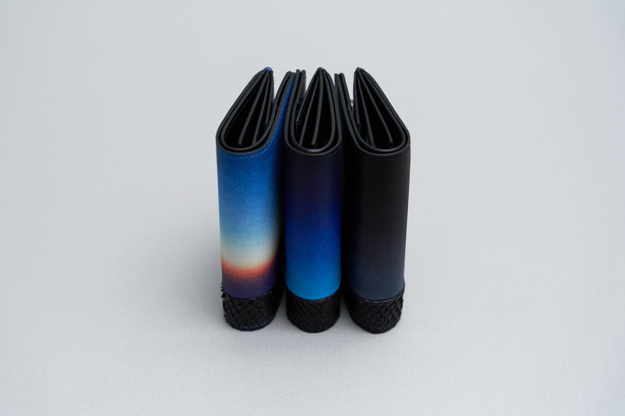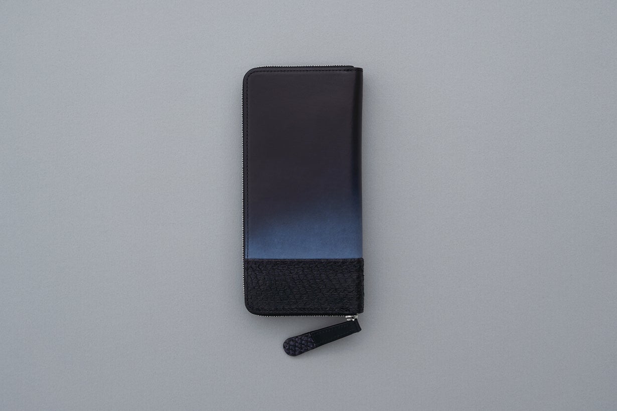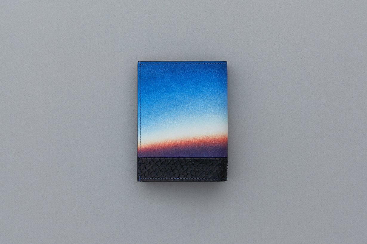 フィッシュレザーの鱗模様を「海の波」に見立て、グラデーションレザーを「変わりゆく空」に見立て、美しい風景をそのままお財布に。