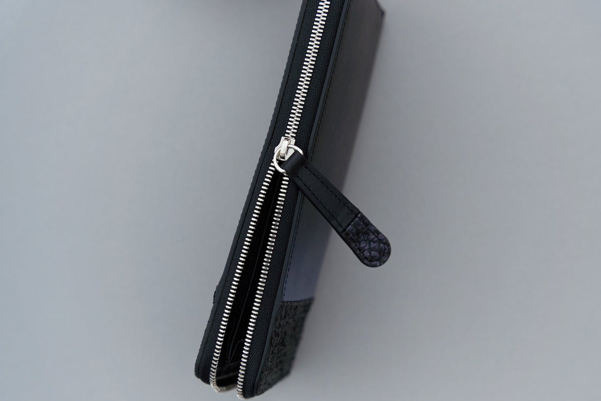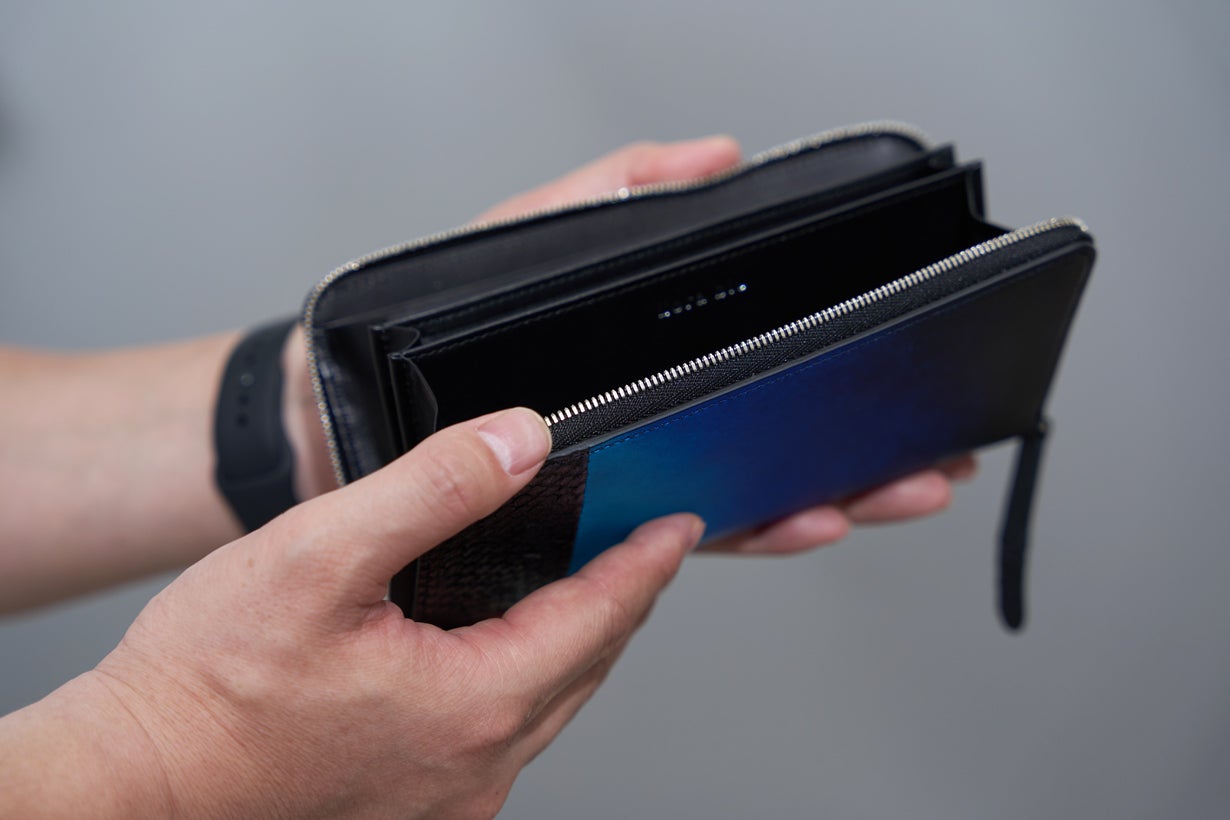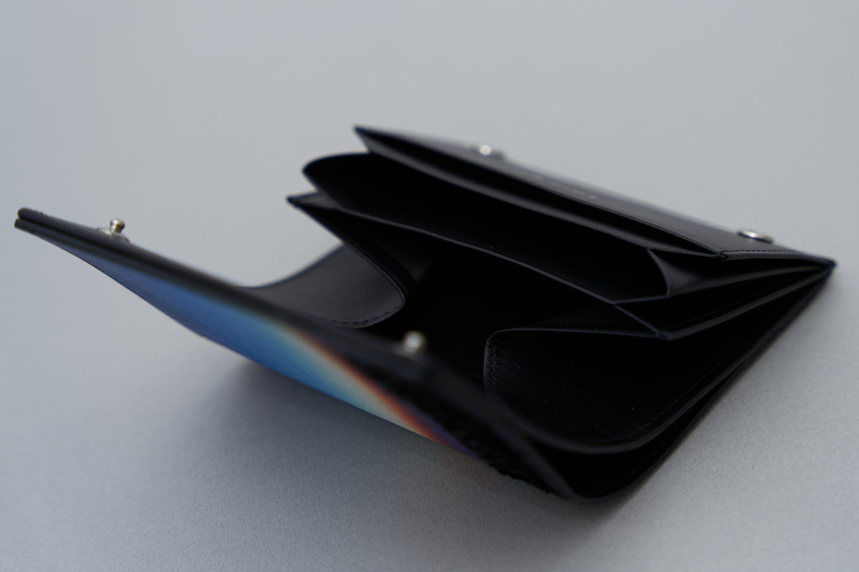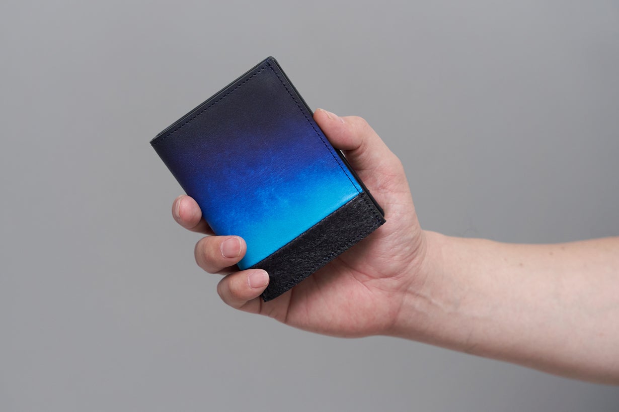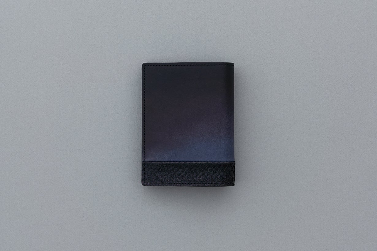 フィッシュレザーの鱗模様を「海の波」に見立て、グラデーションレザーを「変わりゆく空」に見立て、美しい風景をそのままお財布に。