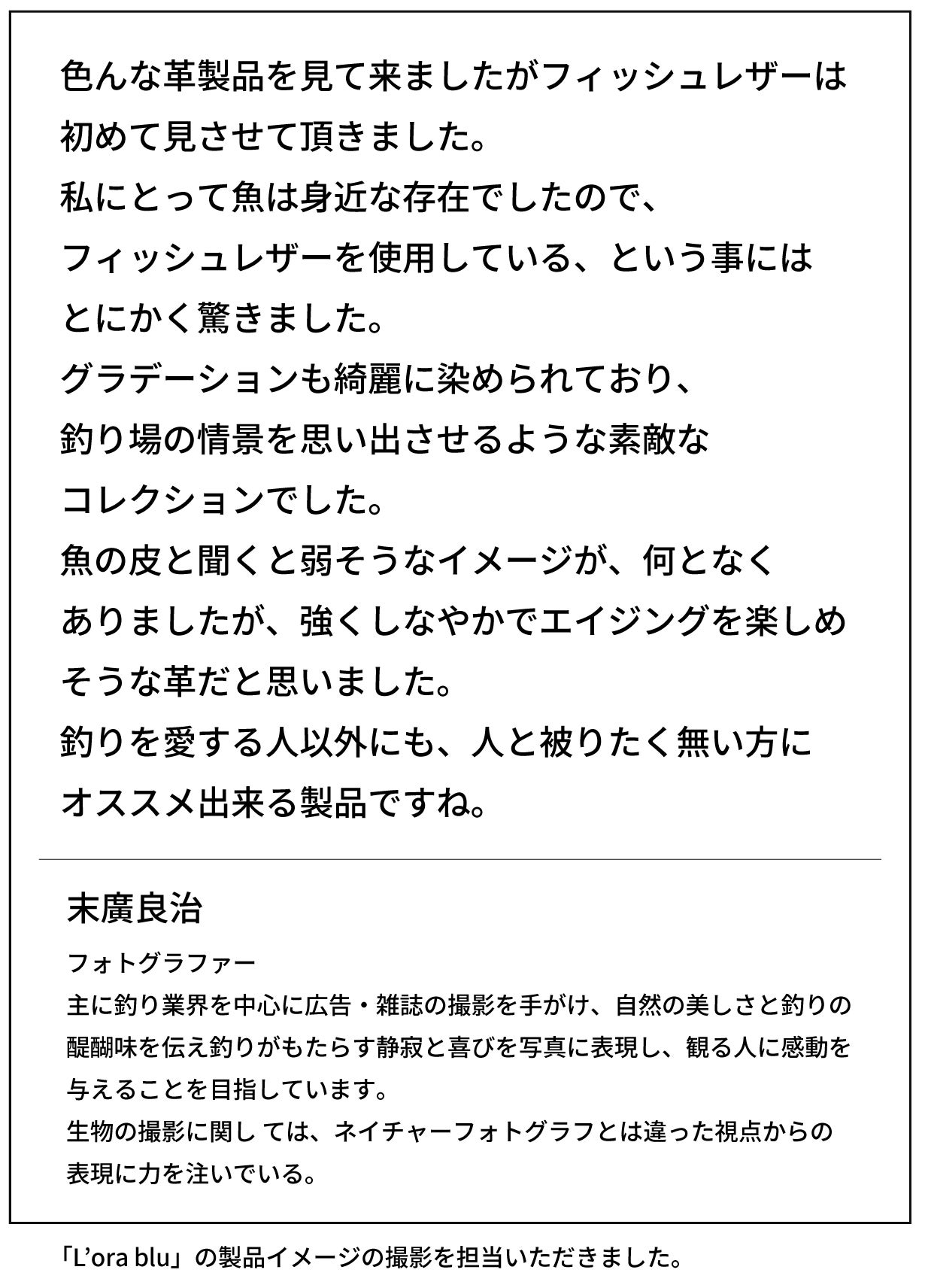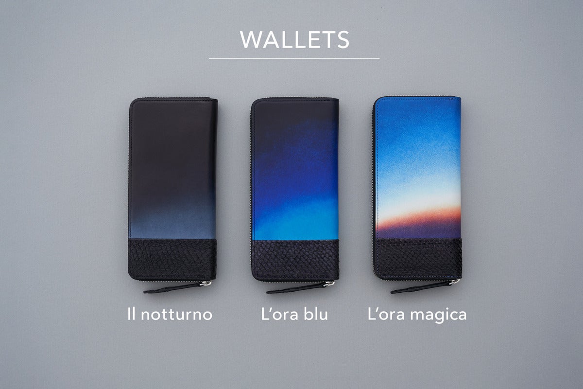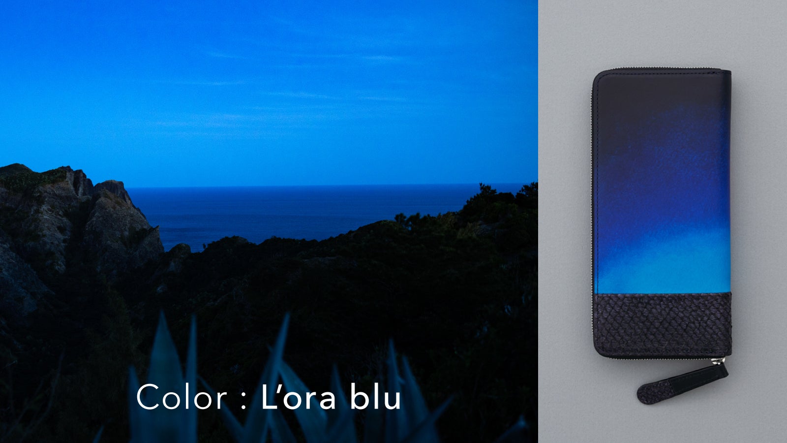 ある日、釣りをしていて、世界が青色に染まる瞬間「ブルーアワー」の海を眺めている時に、「フィッシュレザーで海の波・グラデーションレザーで変わりゆく空を表現したレザーアイテムがつくれないだろうか」と思いついたのが、「L'ora blu」誕生のきっかけです。
