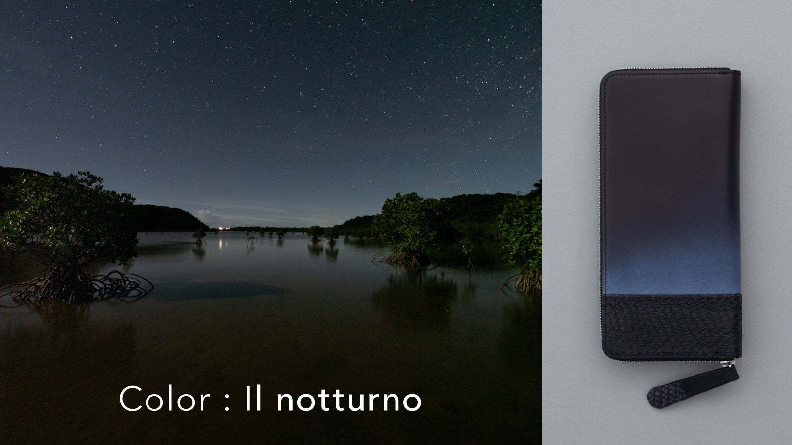 財布をキャンバスに見立て、夜の海を描きました。美しいグラデーションに仕上がるまで、何度も試作を重ねてようやく納得のいく色に仕上がりました。