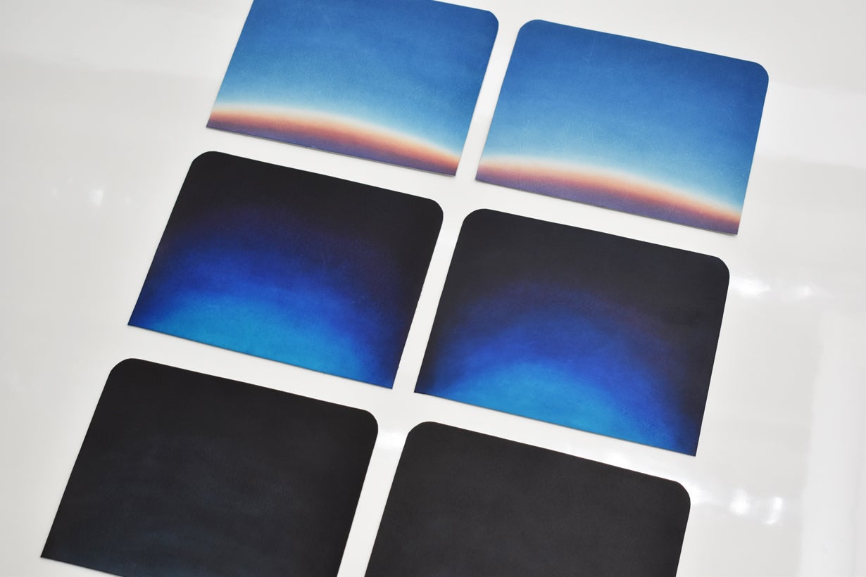 職人の手によって、姫路レザー(ステア)を一枚一枚丁寧に「変わりゆく空の色」をイメージしたグラデーションに染め上げました。