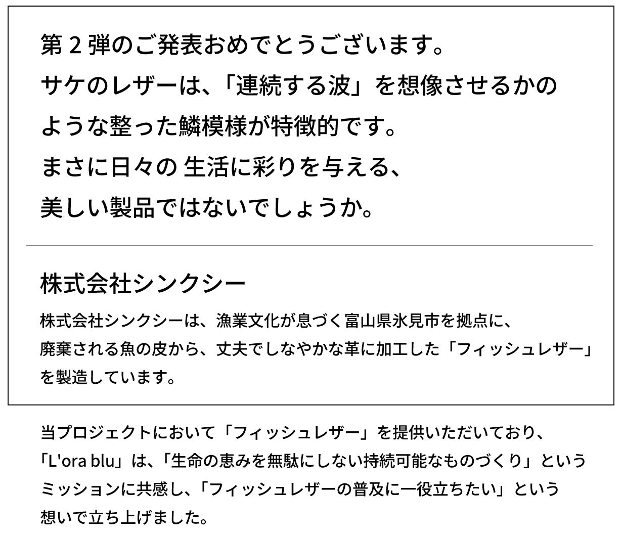 フィッシュレザー・姫路レザー(国産レザー)による「生命の恵みを無駄にしない持続可能なものづくり」と、ご縁をいただいた兵庫県豊岡市の「鞄産業」「財布」の振興に少しでも力になれればという想いからスタートしたプロジェクト。
