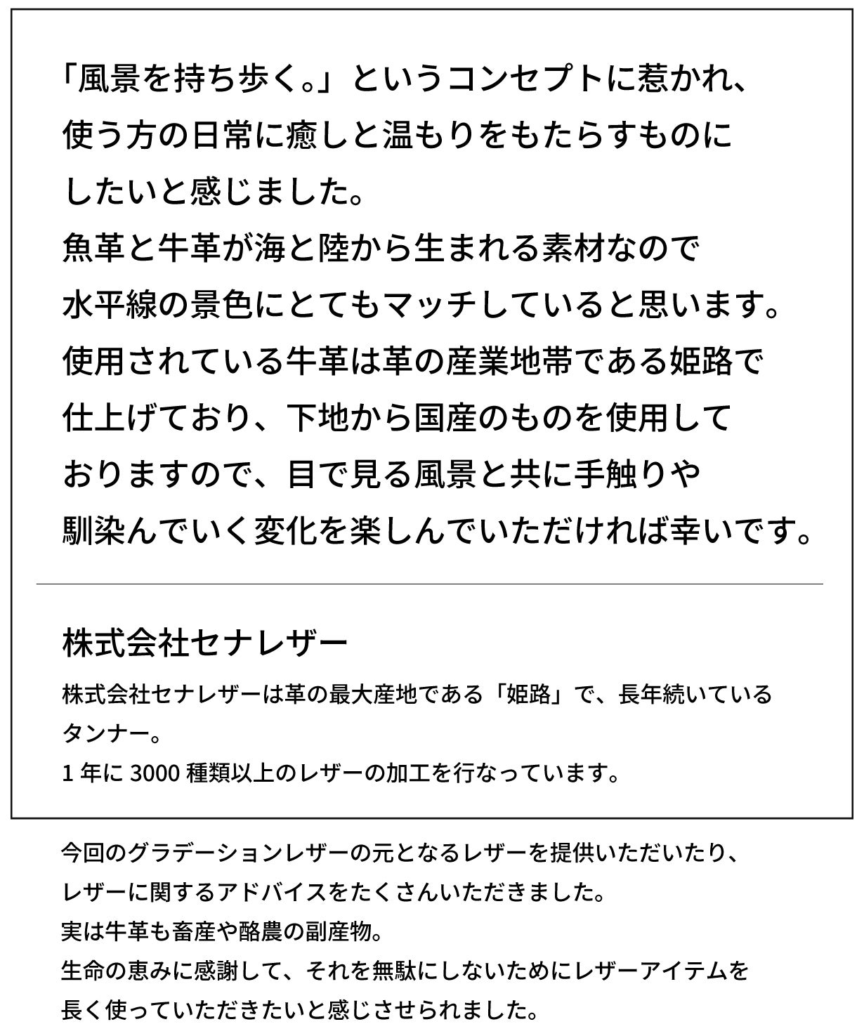 「美しいグラデーション」「美しい鱗模様」のコンビネーションで表現する「美しい海の風景」。「眺めたくなるレザーアイテム」「他の人に見せたくなるレザーアイテム」を目指してつくりました。