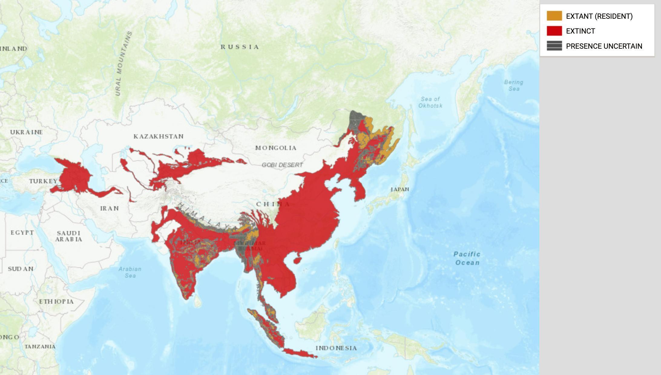 トラの生息域の変化 🟥は絶滅した地域、🟨は生息している地域