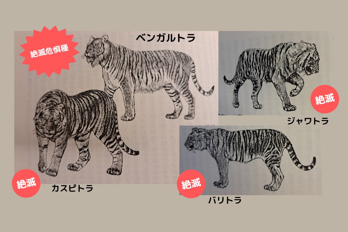 トラには、別種とまではいえないものの、生息場所により形態に変異が見られる「亜種」があります。20世紀初頭にはアジア広域に9亜種が生息していましたが、1940年代から1980年代の間に、バリトラ、カスピトラ、ジャワトラ、そして最近ではアモイトラの4亜種が絶滅してしまいました。