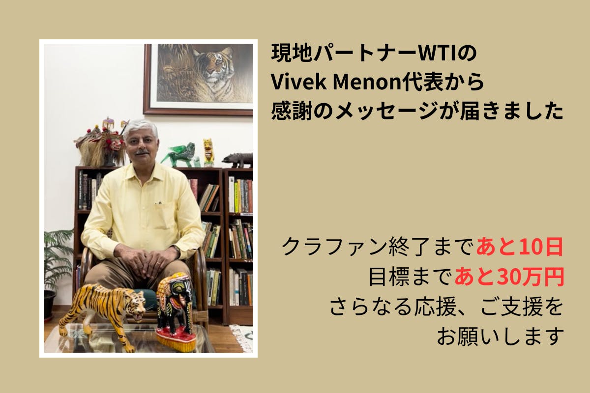 「WTIのトラとゾウを保護する活動へご支援をいただき、 日本の皆さんとJTEFに感謝申し上げます。インドではトラは国の動物(国獣)、ゾウは国の遺産動物(ナショナル・ヘリテージ・アニマル)に指定されています。JTEFは、トラについては主に中央インド(ビダルバ地方)で、ゾウについては南インド(ケララ州など)で、彼らが生息地間を広く移動する権利を保障するプロジェクトに貢献されています。このWTIとJTEFの取組みは、保護活動が同時に現地住民にとっての利益にもなることを目指しています。そうすることで、トラ、ゾウ、現地住民のwin-winの関係を作り上げることができ、長期的な共存が可能になるからです。プロジェクトを成功させるうえでは、日本の皆さんのご支援が大きな助けになります。(日本語で)『ありがとうございます』。」