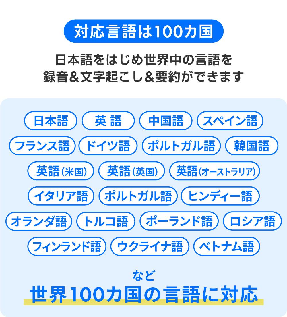 対応言語は、日本語、英語、中国語、スペイン語、フランス語、ドイツ語、ポルトガル語、韓国語、英語(米国)、英語(英国)、英語(オーストラリア)、イタリア語、ヒンディー語、オランダ語、トルコ語、ポーランド語、フィンランド語、ウクライナ語、ベトナム語、ロシア語などです。
