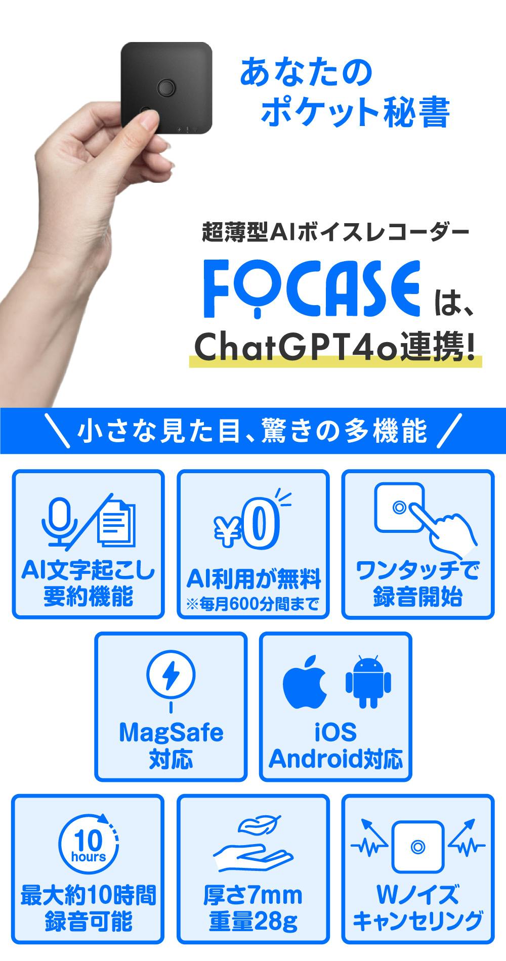 「FoCase」ChatGPT4o 連携AIボイスレコーダーは、長時間の会議や講義、メディア取材など、文字による記録が必要なシーンが多く存在します。これまで多くの方々が、大量の時間や労力を費やしてきたのではないでしょうか?この商品は、そうした問題に直面する人々を支援するために開発されました。