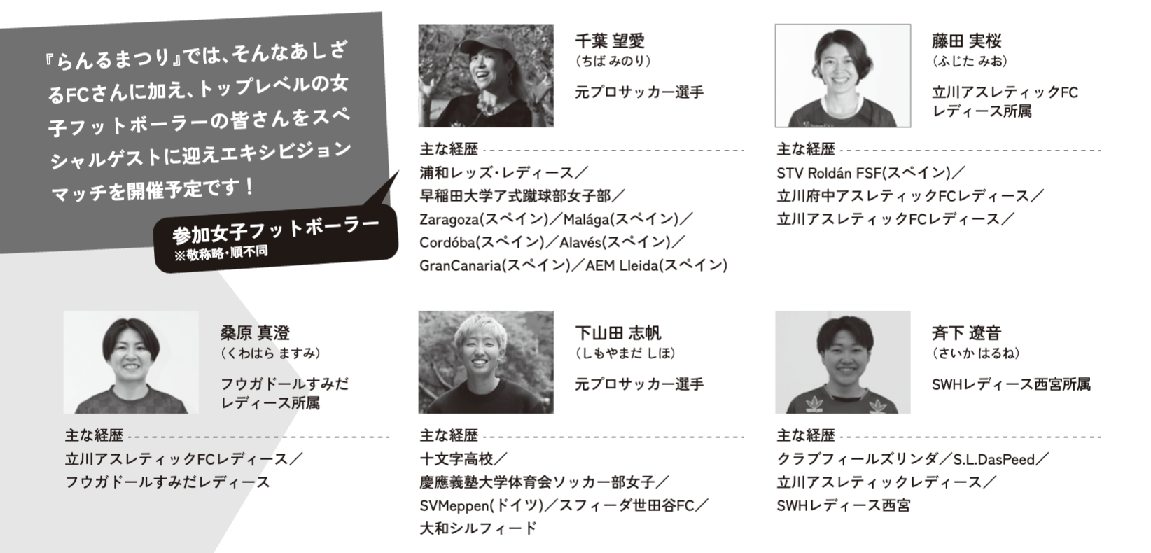 皆さま、こんにちは!「らんるまつり」プロジェクトを応援いただき、ありがとうございます。本日の進捗状況をご報告させていただきます。活動の概要と進捗状況総支援額:935,860円達成率:93%皆さまの温かいご支援に心から感謝しております。引き続き何卒、宜しくお願いいたします。女子フットボーラー(フットボール(サッカー)、フットサル)「らんるまつり」では、トップレベルの女子フットボーラーの皆さんをスペシャルゲストとしてお迎えしエキシビジョンマッチを開催予定です。本日は、そのスペシャルゲストとしてご参加いただく選手たちをご紹介させていただきます。※順不同藤田 実桜(ふじた みお)選手所属: 立川アスレティックFCレディース藤田実桜選手は、最初に「らんるまつり」への参加が決まった選手です。藤田さんにはヴォルフェ立ち上げ期から日本女子フットサル界のイノベーター(勝手な木下の認識。この手のやつは、こっちを立てればあっちが立たず、難しいというのは重々承知していつつ。。。あえて言い切る。。。!)として色々とご相談させて頂いていて、これまで複数回、旭川エリアでフットサルの普及・強化をご相談させていただいていました。「ACTIVE WOMEN's SOCIALIZE DAY~スポーツでつながり交流を楽しむコミュニケーション・イベント~」を開催(2023/9/21)https://woelfe.team/info/Zp7rQKL8「女子フットサル日本代表選手、藤田実桜クリニック」を開催 (2023/9/21)https://woelfe.team/info/7kX5t186「女子フットサル日本代表選手、藤田実桜クリニック」を開催(2023/12/10)https://woelfe.team/info/DQnjxm9w立川アスレティックFCでの活躍に加え、2015年から女子日本代表に選出され、2018年にはAFCフットサル選手権で準優勝の成績を収めています。スペインでのプレー経験を経て再び日本に戻り、現在はチームのキャプテンとして選手にとってもサポーターにとっても精神的支柱になっています。彼女は選手としての競技活動にとどまらず、育成年代の選手育成や良いプレー環境の整備に尽力しており、フットサル界の未来を考えた活動をしています。千葉 望愛(ちば みのり)選手元プロサッカー選手千葉望愛選手との出会いは、2021年のプロタゴニスタでのサポートがきっかけでした。早稲田大学卒業後、浦和レッズレディースに入団し、その後スペインに移籍。サラゴサやマラガでの8年間のスペイン生活を経て、今年引退を発表。現役時代には、海外でプレーする女子サッカー選手を集めたプロタゴニスタを立ち上げ、「人生の主役はわたし」を合言葉に、主体的に自由で楽しむ姿勢を広めています。海外サッカーPROTAGONISTAhttps://note.com/mino18/m/ma7c87f7c6a2a下山田 志帆(しもやまだ しほ)選手元プロサッカー選手下山田志帆選手の参加は別件の話をしていた際に「らんるまつり」への興味を持っていただいたことがきっかけでした。慶應義塾大学卒業後、ドイツでプロサッカー選手として活動し、帰国後はスフィーダ世田谷に所属。その後、Co-Founderの内山穂南さんと共に株式会社 Rebolt を創業しました。「WAGAMAMAであれ」をキーワードに、女性アスリート向けのプロダクト開発やエデュケーションを行い、女性アスリートの立場から発信を続けてきました。Forbes U30 JAPAN 2021に選出され(!!)、2022年には初の著書「女子サッカー選手です。そして、彼女がいます」を刊行。大和シルフィードに移籍し、2023年に引退を発表しました。「女子サッカー」と一括りにできない(と、木下は少なからず感じています)リアルを見せてくれた人の一人、心の底から尊敬しています。株式会社レボルトhttps://reboltinc.com/斉下 遼音(さいか はるね)選手所属: SWHレディース西宮斉下遼音選手は藤田実桜選手の紹介で「らんるまつり」に参加してくださることになりました。早稲田大学卒業後、立川アスレティックレディースに入団し、その後SWH西宮に移籍、現在も所属しています。立川時代には得点王に輝き、日本代表にも選出されました。文武両道を体現し、特に北海道出身である彼女が「北海道は圧倒的ホーム」と語ることから、らんるまつりでのプレーが非常に楽しみです。桑原 真澄(くわはら ますみ)選手所属: フウガドールすみだレディース桑原真澄選手も藤田実桜選手の紹介で参加していただけることになりました。彼女は立川アスレティックレディースやさいたまSAICOLO、そして現在のフウガドールすみだなど、様々なチームで活躍してきており、そのプレーと人柄が高く評価されています。M88(エムハチ)クリニックでのフットサル練習会など女子フットサルの普及活動にも力を入れており、北海道出身で「ますみ応援隊 北海道支部」も存在するとか!応援隊の皆様もらんるまつりにも来てくださると嬉しいですね。越境この人選からお分かりいただけたかと思いますが、フットサルを単なる競技として捉えるのではなく、未来を見据えた活動や生き様を大切にしている選手たちが集まりました。彼女たち(と、いったんはくくらせていただきます)の考えや生き方そのもの