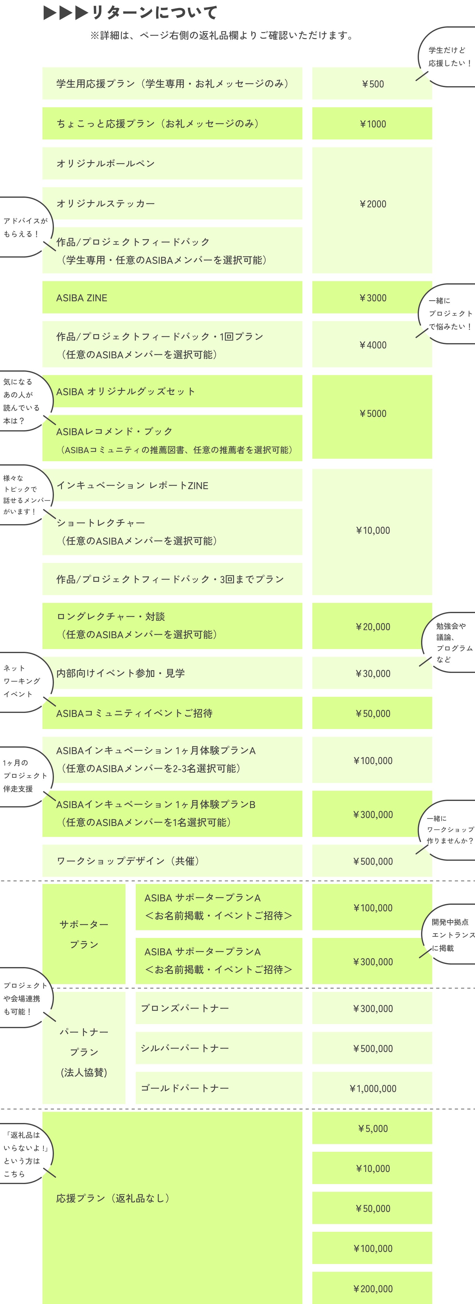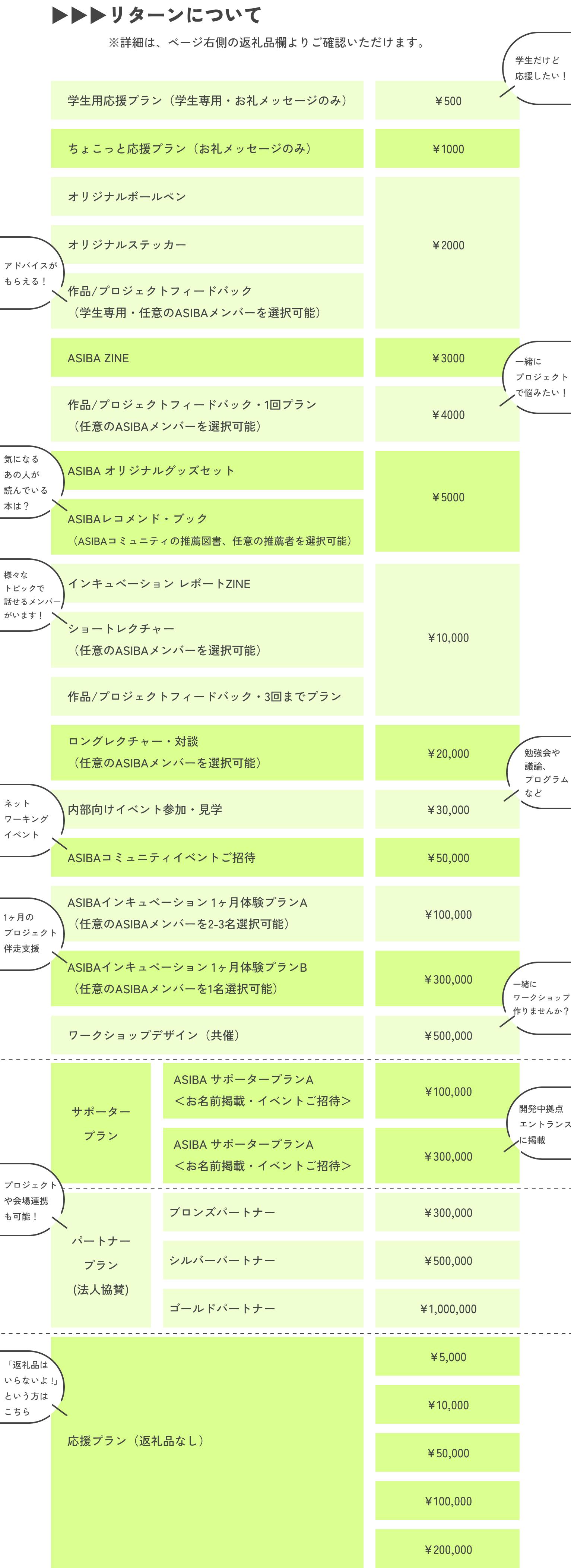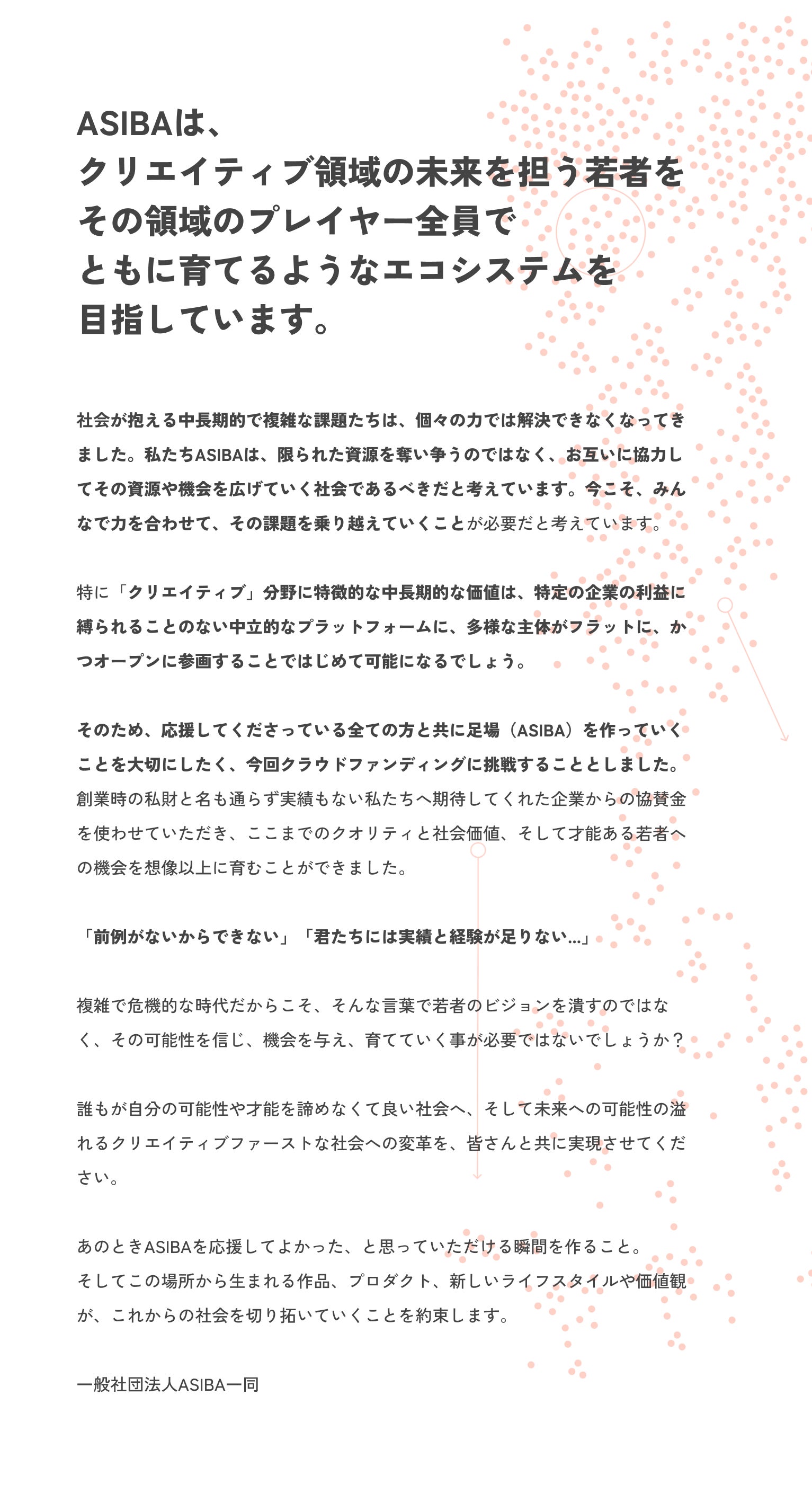 2025/07/30 14:09こんにちは!一般社団法人ASIBA事務局の重松です。私たちのクラウドファンディングは、昨日7月29日をもちまして、目標金額を達成し終了となりました。みなさまの応援・ご支援・ご協力、誠にありがとうございました。おかげさまで、目標金額の150万円を上回り、総勢115名、1,652,388円のご支援を賜ることができました。みなさまの直接のご支援に加え、多くの方によるSNSの拡散などもいただけたことが、達成できた何よりも大きな要因であったと思います。重ねて、御礼申し上げます。いただいたご支援は、ASIBAインキュベーションプログラム第3期のために、大切に使用させていただきます。代表の二瓶からも、御礼のメッセージをお送りさせていただきます!ーーーーこんにちは、一般社団法人ASIBA代表理事の二瓶です。この度は、ASIBAとして初のクラウドファンディングに多くのご支援をいただきまして、誠にありがとうございます。クラファンを終えて気づいたのは、いただいた金額の多寡を超えて、こんなにも多くの素敵な方々に、信頼している仲間や憧れている先輩、いつも何も言わずにただ背中を押してくれているみなさんに、応援してもらっているという実感がなによりも励みになる、ということです。2年間かけて耕してきたこの土壌が、これからのクリエイティブを担う若者を育てる肥沃な大地となるように、みなさんからいただいた資金と期待を手に、丁寧に水やりをしていきます。近視眼的な最適化や社会に溢れる「どうしようもなさ」を疑い、自分の見たい景色を実現させようと果敢に社会に挑戦する彼ら/彼女らを、最近のASIBAでは「クリエイティブ・アントレプレナー」と呼んでいます。数字や売上だけを評価軸とするのではなく、文化やデザインに価値を見出し、それを社会的な価値へと乗せようと挑む「クリアン」を信じて、これからもみなさんとともに走り続けていきたいです。まだまだ旅路は始まったばかりですが、今後ともどうぞよろしくお願いいたします!ーーーーさて、現在ASIBAインキュベーションプログラム3期生は、全国各地・同時多発実証実験「DEMO WEEK」を開催中です。各チームが自分たちのプロジェクトにあった場所で、実践し、思考し、また走り出します。そんな3期生たちの実践を、ぜひ直接ご覧ください。各種SNSや特設サイトでもDEMO WEEKや3期生の様子を発信し続けますので、ぜひ挑戦を追って応援いただけると嬉しいです!詳しくはこちらをご覧ください↓【DEMO WEEK】開催!プロジェクト紹介!リターンについては、順次みなさまのもとにお届けいたします。日程調整や事前のお打ち合わせなどが必要なリターンに関しては、改めて事務局からメールにてご連絡いたしますので、ご対応いただけますと幸いです。ASIBAも、3期生もここからがまた新しいスタートです。今回ご支援いただいたみなさまに恩返しができるよう、引き続き私たちの目指すビジョンに向かって走り続けたいと思います。暖かく、応援・見守っていただけますと幸いです。この度は、誠にありがとうございました!ーーーーーASIBA Creative Incubation Program公式サイトASIBA 公式InstagramASIBA 公式XASIBA 公式HP もっと見る