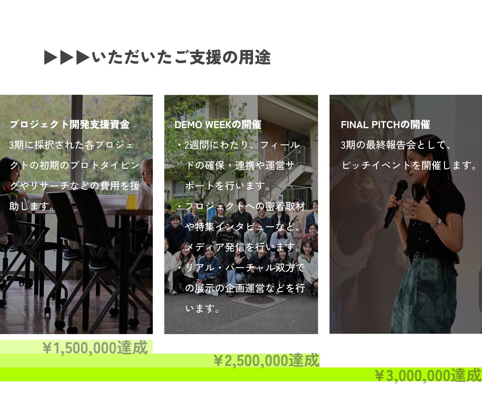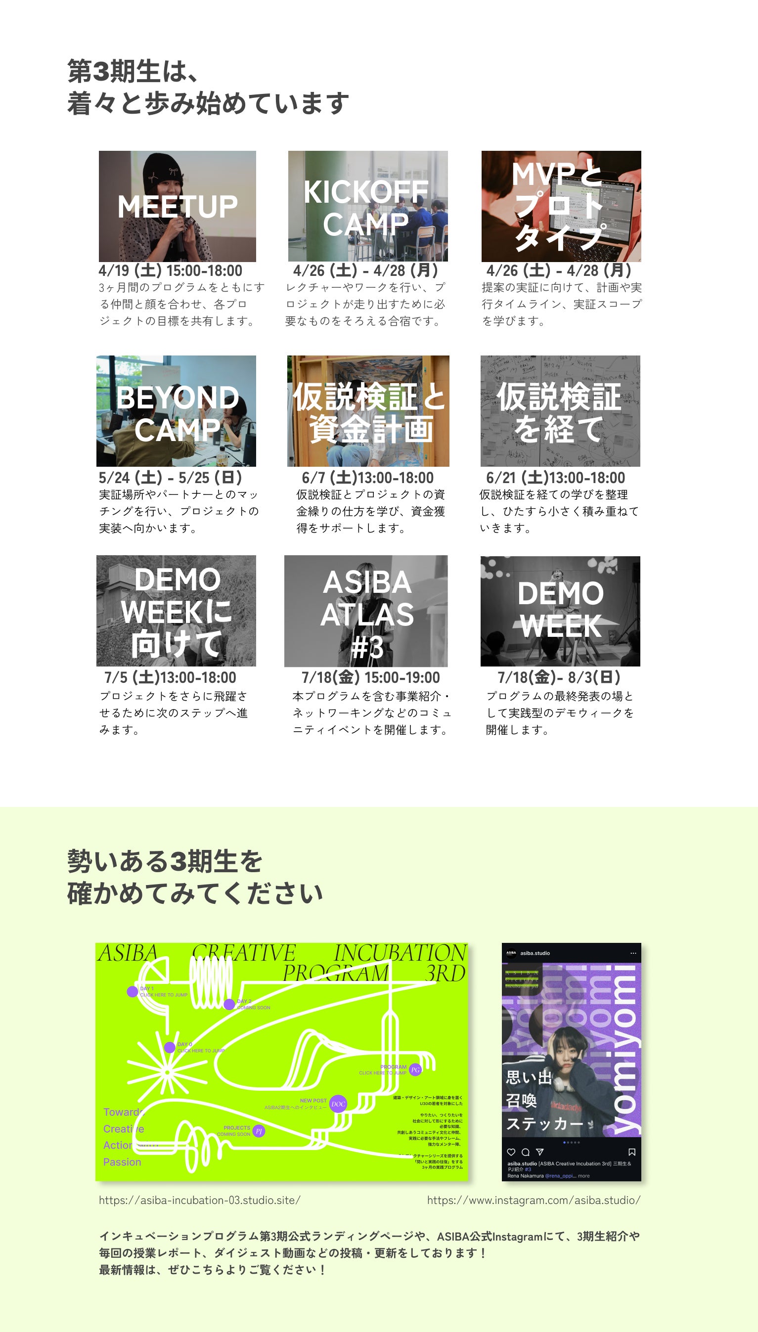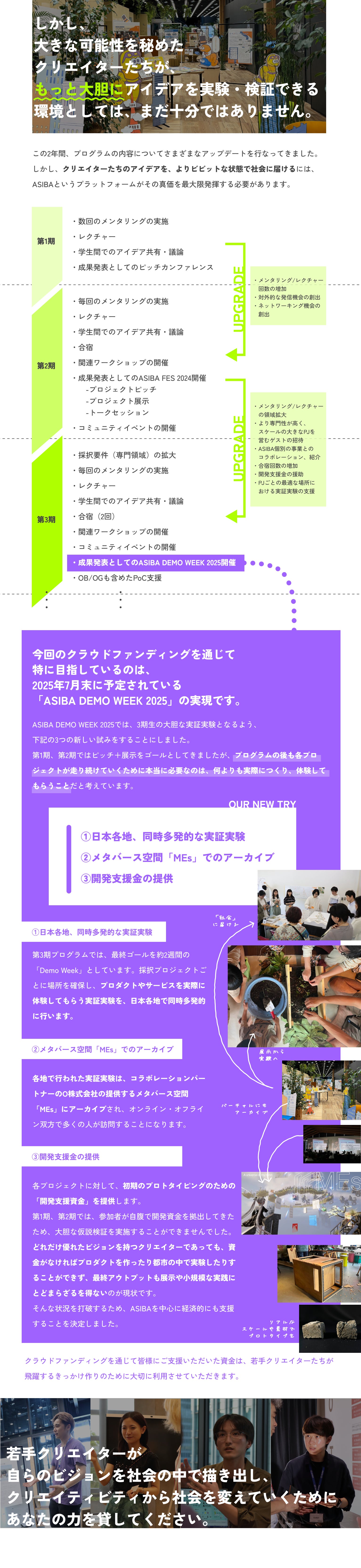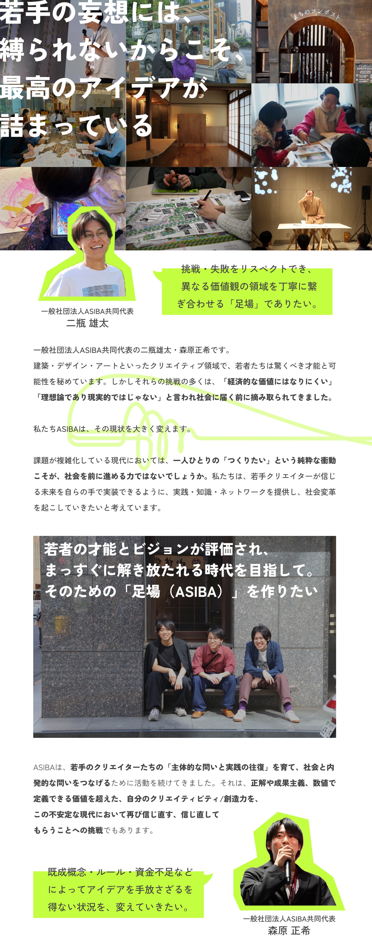 2025/07/30 14:09こんにちは!一般社団法人ASIBA事務局の重松です。私たちのクラウドファンディングは、昨日7月29日をもちまして、目標金額を達成し終了となりました。みなさまの応援・ご支援・ご協力、誠にありがとうございました。おかげさまで、目標金額の150万円を上回り、総勢115名、1,652,388円のご支援を賜ることができました。みなさまの直接のご支援に加え、多くの方によるSNSの拡散などもいただけたことが、達成できた何よりも大きな要因であったと思います。重ねて、御礼申し上げます。いただいたご支援は、ASIBAインキュベーションプログラム第3期のために、大切に使用させていただきます。代表の二瓶からも、御礼のメッセージをお送りさせていただきます!ーーーーこんにちは、一般社団法人ASIBA代表理事の二瓶です。この度は、ASIBAとして初のクラウドファンディングに多くのご支援をいただきまして、誠にありがとうございます。クラファンを終えて気づいたのは、いただいた金額の多寡を超えて、こんなにも多くの素敵な方々に、信頼している仲間や憧れている先輩、いつも何も言わずにただ背中を押してくれているみなさんに、応援してもらっているという実感がなによりも励みになる、ということです。2年間かけて耕してきたこの土壌が、これからのクリエイティブを担う若者を育てる肥沃な大地となるように、みなさんからいただいた資金と期待を手に、丁寧に水やりをしていきます。近視眼的な最適化や社会に溢れる「どうしようもなさ」を疑い、自分の見たい景色を実現させようと果敢に社会に挑戦する彼ら/彼女らを、最近のASIBAでは「クリエイティブ・アントレプレナー」と呼んでいます。数字や売上だけを評価軸とするのではなく、文化やデザインに価値を見出し、それを社会的な価値へと乗せようと挑む「クリアン」を信じて、これからもみなさんとともに走り続けていきたいです。まだまだ旅路は始まったばかりですが、今後ともどうぞよろしくお願いいたします!ーーーーさて、現在ASIBAインキュベーションプログラム3期生は、全国各地・同時多発実証実験「DEMO WEEK」を開催中です。各チームが自分たちのプロジェクトにあった場所で、実践し、思考し、また走り出します。そんな3期生たちの実践を、ぜひ直接ご覧ください。各種SNSや特設サイトでもDEMO WEEKや3期生の様子を発信し続けますので、ぜひ挑戦を追って応援いただけると嬉しいです!詳しくはこちらをご覧ください↓【DEMO WEEK】開催!プロジェクト紹介!リターンについては、順次みなさまのもとにお届けいたします。日程調整や事前のお打ち合わせなどが必要なリターンに関しては、改めて事務局からメールにてご連絡いたしますので、ご対応いただけますと幸いです。ASIBAも、3期生もここからがまた新しいスタートです。今回ご支援いただいたみなさまに恩返しができるよう、引き続き私たちの目指すビジョンに向かって走り続けたいと思います。暖かく、応援・見守っていただけますと幸いです。この度は、誠にありがとうございました!ーーーーーASIBA Creative Incubation Program公式サイトASIBA 公式InstagramASIBA 公式XASIBA 公式HP もっと見る