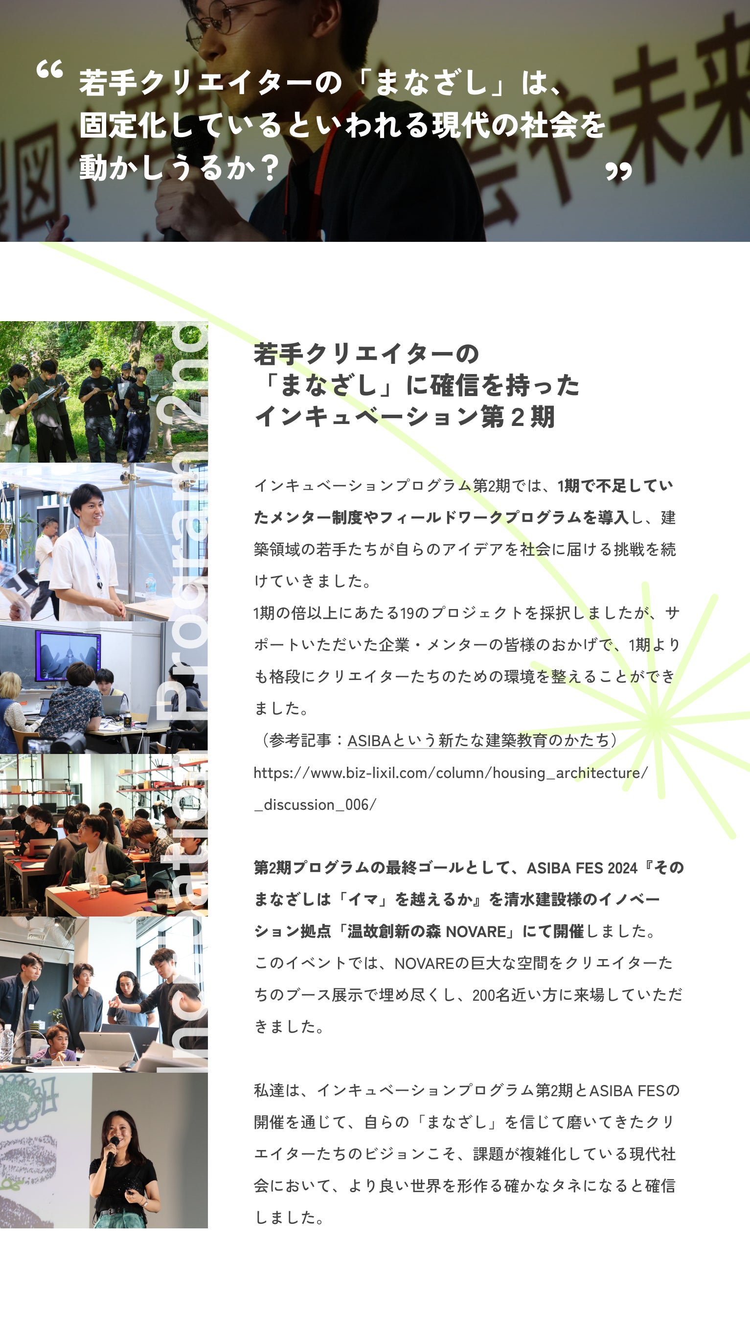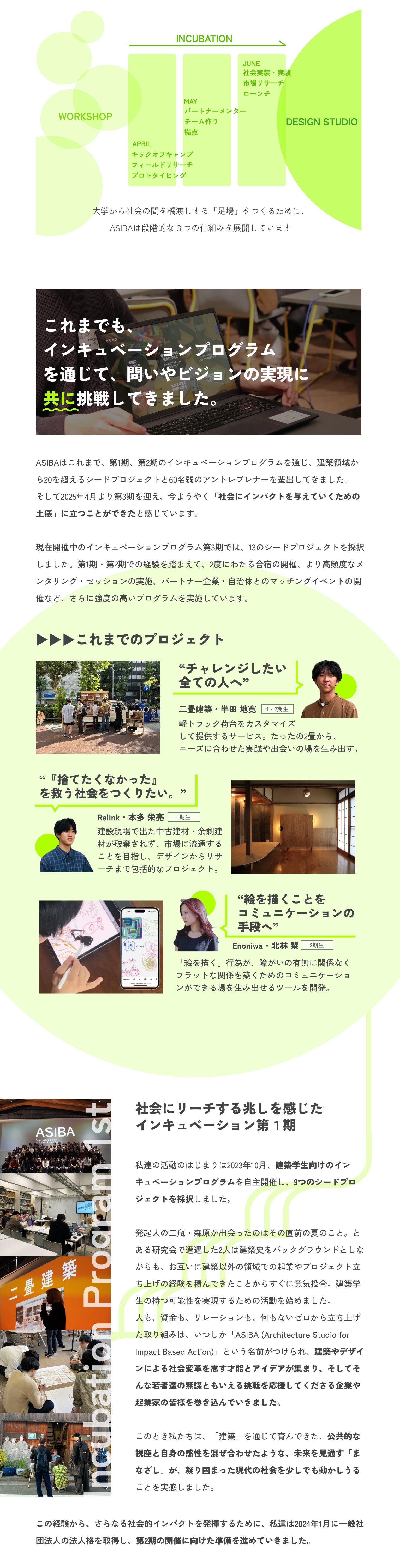 2025/07/29 20:45インキュベーションプログラム1-2期で、レクチャーをしていただいた青木隆幸さんから、応援コメントが届きました!ありがとうございます!【応援コメント】大きな夢に向かって突き進むASIBAのみなさんの姿に、いつも元気をもらってます! 初期の頃から関わらせてもらって、近くでその歩みを見られていることが本当に嬉しいです。 これからもずっと応援してます! そして、ぜひ一緒にプロジェクトやりましょう!!---青木さんには、ビジネスの視点から、どのようにして事業をグロースさせられるのか、そのために必要なタイムラインや計画とはなんなのか、といいよりプラクティカルな内容についてレクチャーいただきました。また、そもそもなぜ青木さんが起業するに至ったのか、「なぜ自分がやるべきなのか」という当事者性という熱いお話もいただき、自分の根底にあるプロジェクトに対する想いを忘れてはいけない、と一層身が引き締まりました。現在もSORABITOとは交流があり、引き続き事業単位でもご一緒にお仕事ができるようASIBA一同頑張ってまいります!青木 隆幸SORABITO株式会社 / ファウンダー愛知県出身。建設会社の長男として生まれ、幼少の頃より現場が身近にある環境で育つ。東日本大震災をきっかけに起業を決意し、建機流通事業を展開後、2014年に「世界中の明日をつくる」をミッションとしたSORABITO株式会社を創業。建設領域の課題解決に向けて、建設・建機レンタルDXサービス「i-Rental」、建設向けDXサービス「GENABx」に取り組む。最新情報は、本プログラムの公式サイトやASIBA公式SNSなどで随時更新中です。ぜひ3期生の活動を応援・見届けてください!みなさまのご支援を、お待ちしております。ーーーーーASIBA Creative Incubation Program公式サイトASIBA 公式InstagramASIBA 公式XASIBA 公式HP もっと見る