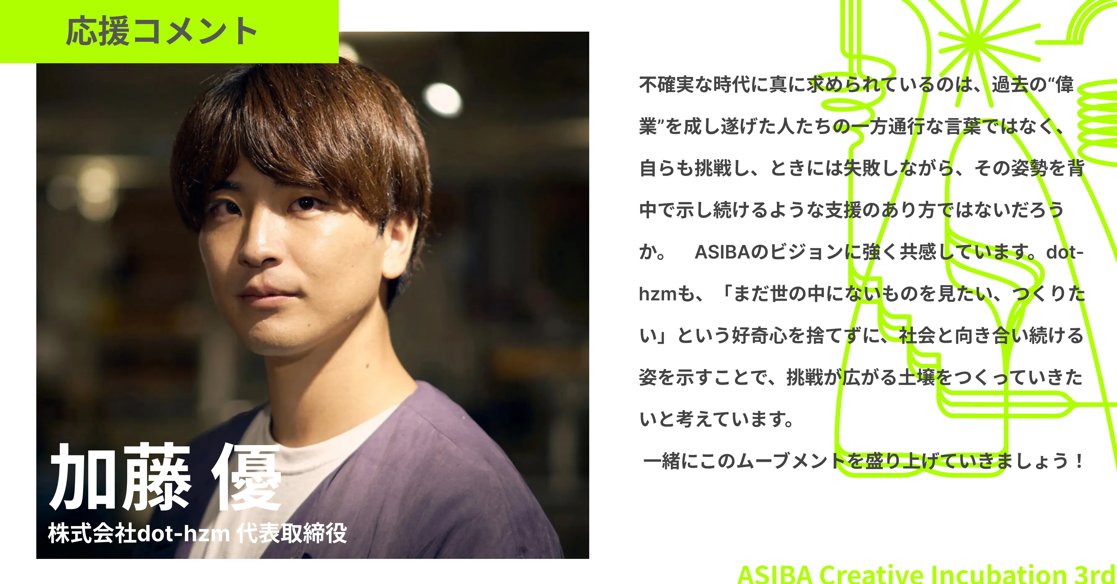 インキュベーションプログラム3期で、レクチャーをしていただいた加藤優さんから、応援コメントが届きました!