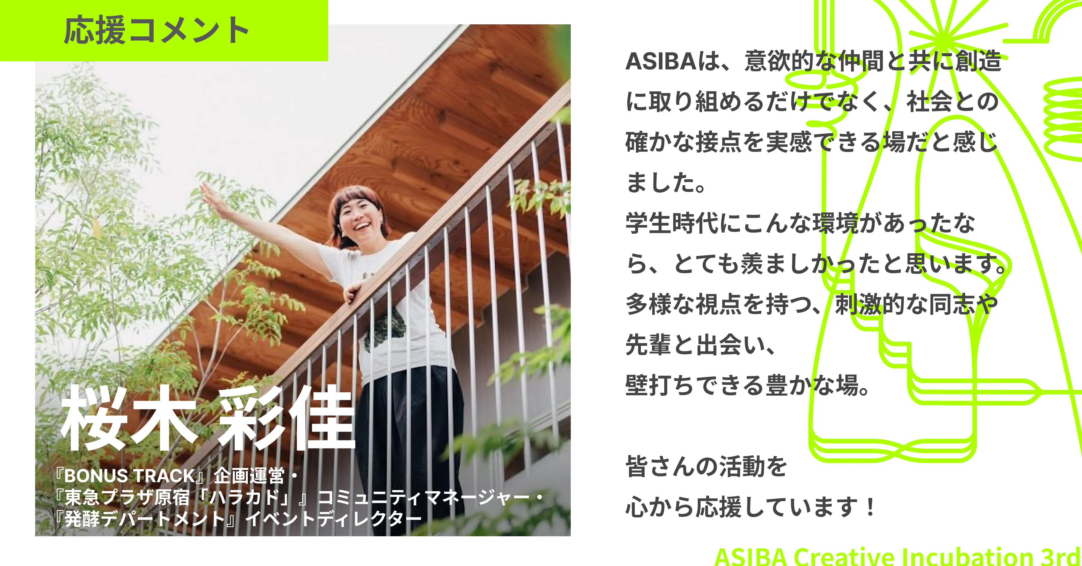 ASIBA Creative Challenge 2025でスポットメンターを務めていただいた、桜木彩佳さんから、応援コメントが届きました!