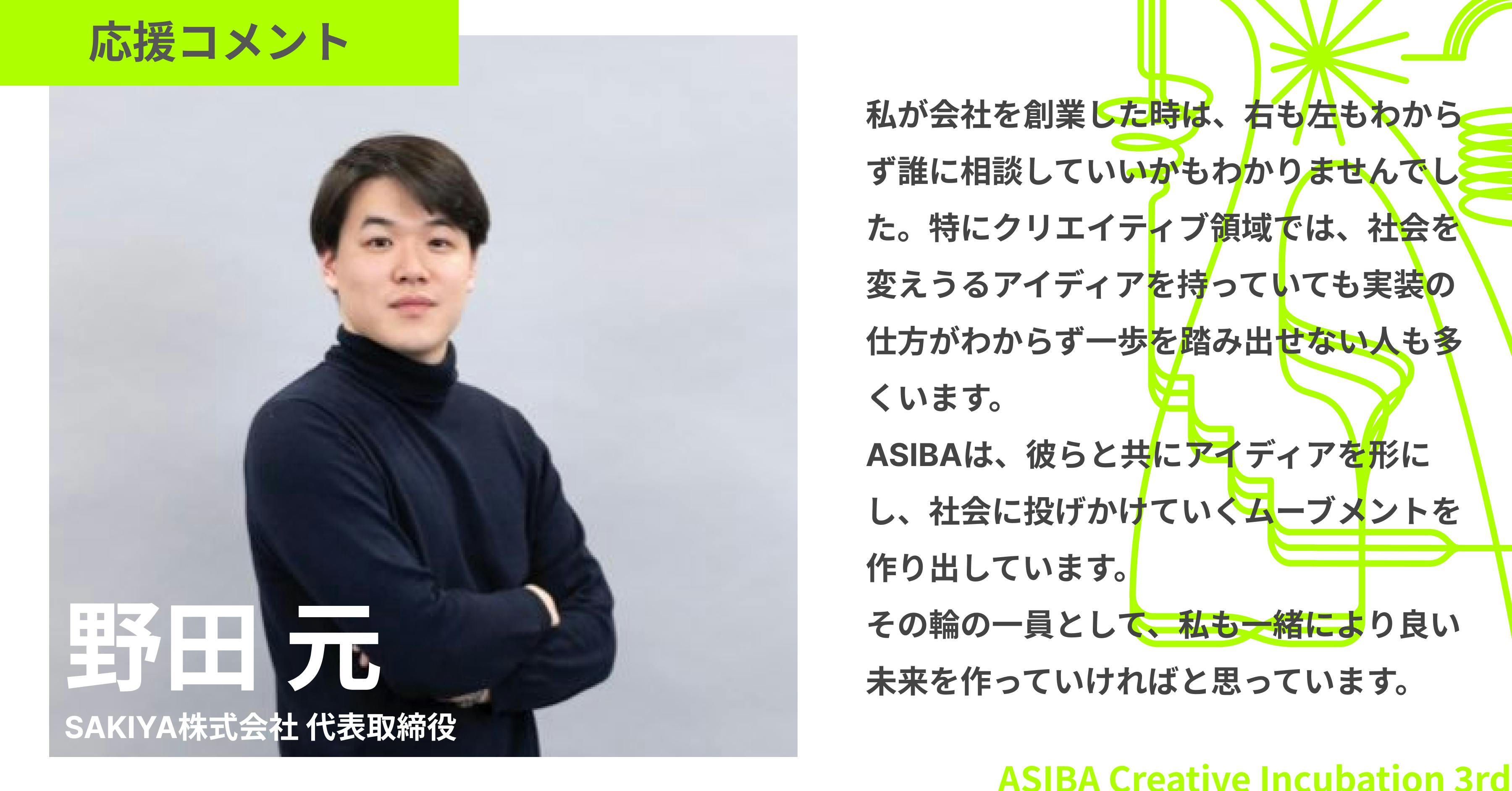 インキュベーションプログラム3期で、メンターを務めていただいている野田 元さんから、応援コメントが届きました!