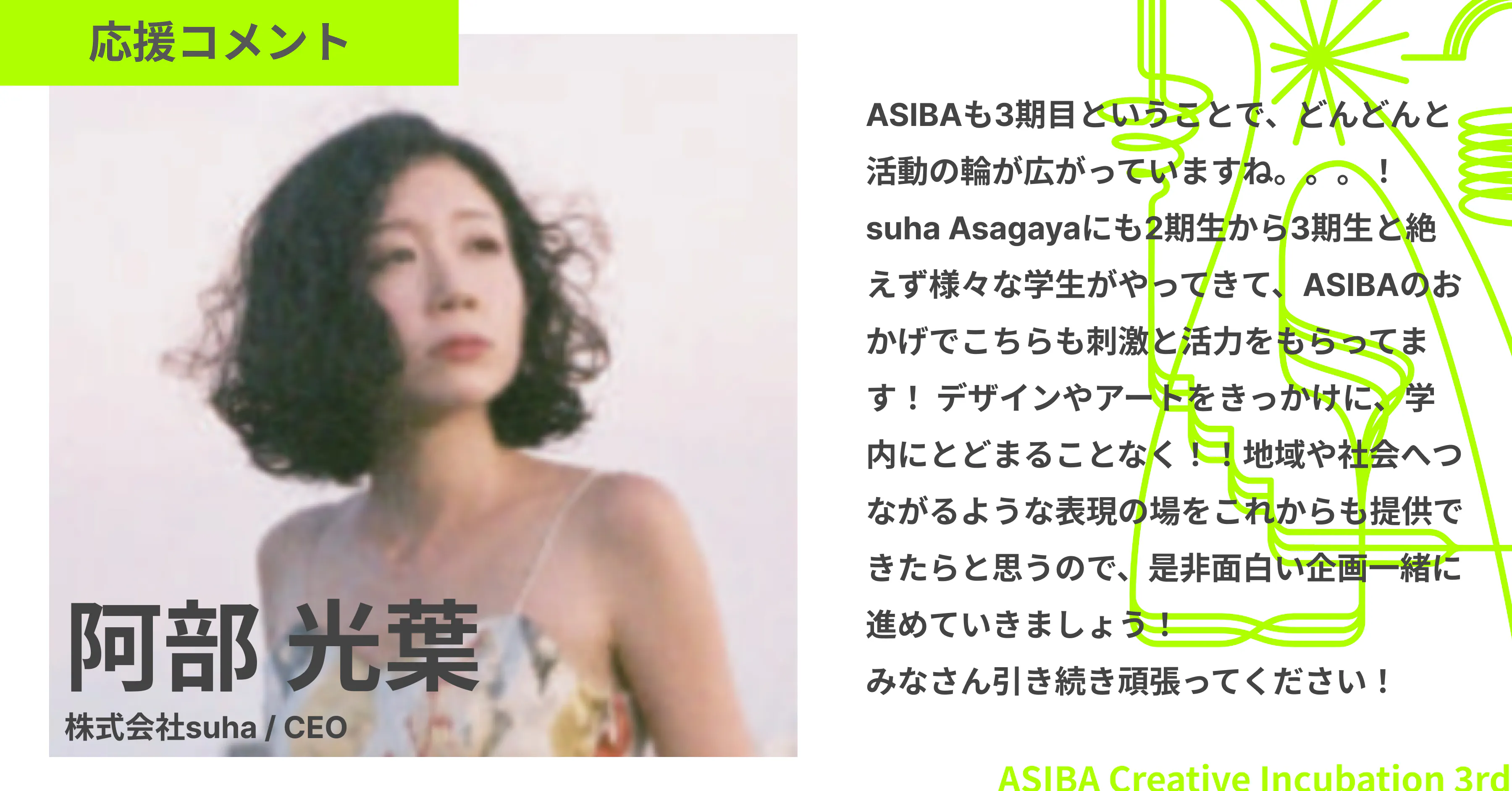 インキュベーションプログラム2期でメンターを務めていただいた、阿部光葉さんから、応援コメントが届きました!