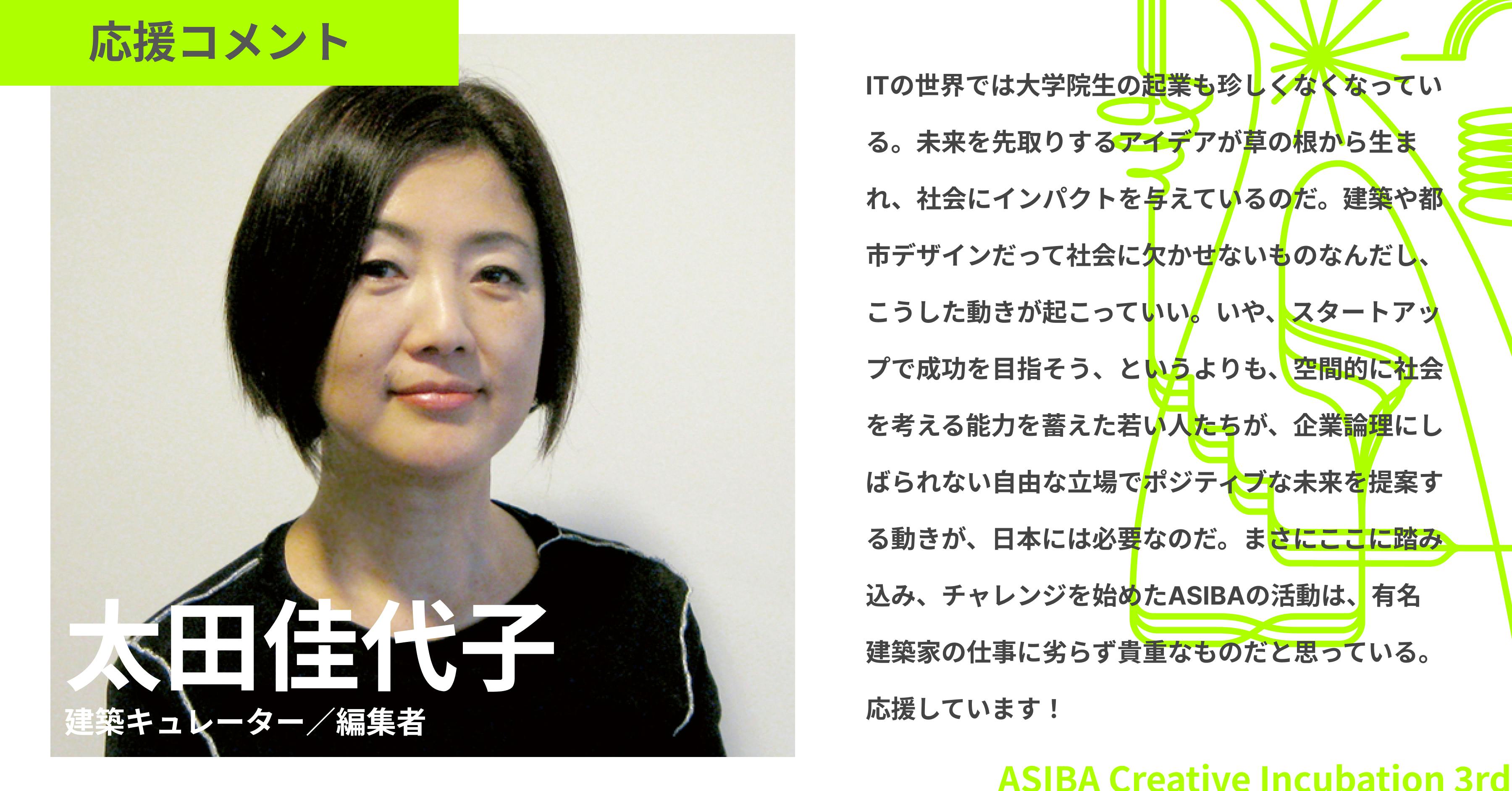 ITの世界では大学院生の起業も珍しくなくなっている。未来を先取りするアイデアが草の根から生まれ、社会にインパクトを与えているのだ。建築や都市デザインだって社会に欠かせないものなんだし、こうした動きが起こっていい。いや、スタートアップで成功を目指そう、というよりも、空間的に社会を考える能力を蓄えた若い人たちが、企業論理にしばられない自由な立場でポジティブな未来を提案する動きが、日本には必要なのだ。まさにここに踏み込み、チャレンジを始めたASIBAの活動は、有名建築家の仕事に劣らず貴重なものだと思っている。応援しています!