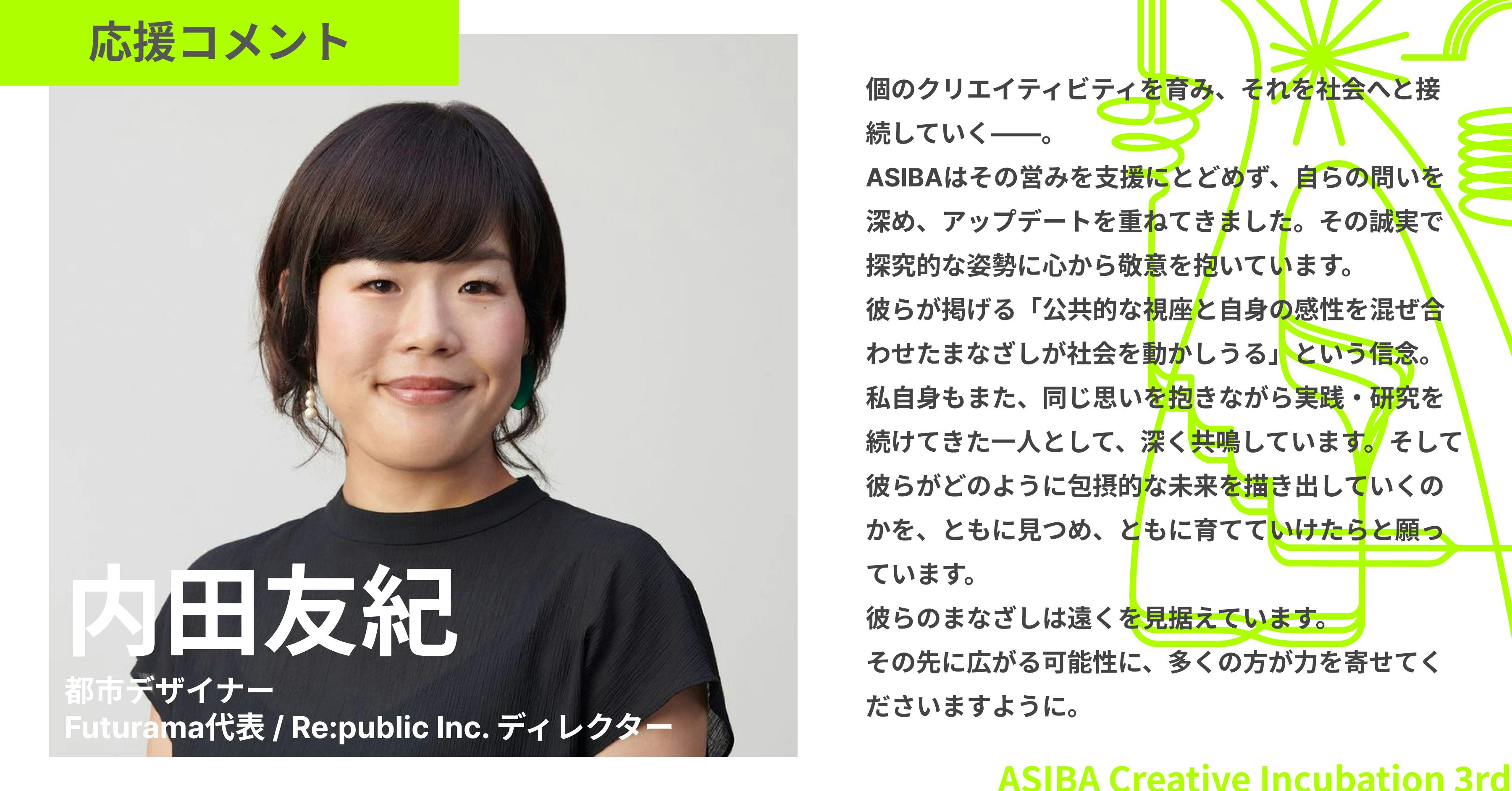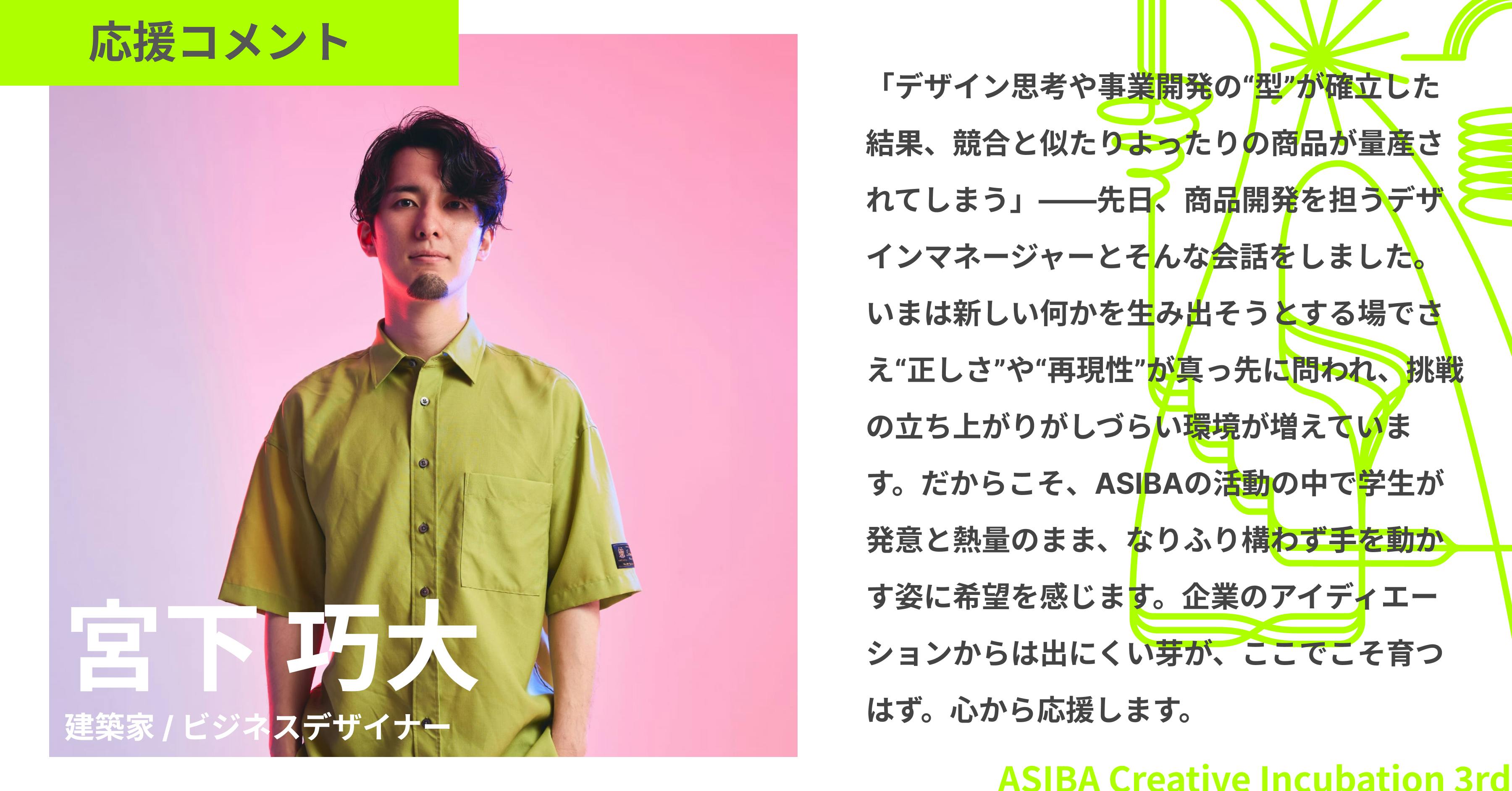 AI に関するワークショップで審査員を務めていただいた、宮下 巧大さんから、応援コメントが届きました!ありがとうございます!【応援コメント】「デザイン思考や事業開発の“型”が確立した結果、競合と似たりよったりの商品が量産されてしまう」——先日、商品開発を担うデザインマネージャーとそんな会話をしました。いまは新しい何かを生み出そうとする場でさえ“正しさ”や“再現性”が真っ先に問われ、挑戦の立ち上がりがしづらい環境が増えています。だからこそ、ASIBAの活動の中で学生が発意と熱量のまま、なりふり構わず手を動かす姿に希望を感じます。企業のアイディエーションからは出にくい芽が、ここでこそ育つはず。心から応援します。---宮下さんには、2024年4月に行われたイベント、「生成AIアイデアソン 作られ方の脱構築」にて審査員、トークイベントの登壇をしていただきました。建築都市領域以外の音楽、アート、UIUXデザイン、プロダクトデザインなど様々な領域の方にご参加いただいたイベントです。参加者たちの提案に対し、生成することだけでなく、どのようにしてそれに再現性を持たせるか、などビジネスデザインの視点からもご講評いただけました。宮下 巧大建築家 / ビジネスデザイナー経歴:2024/04 - SAMURAI ARCHITECTS2023/08 - quantum2020/05 - PLAID2019/12 - Inazma2018/02 - ビジネス図解研究所2017/04 - 仲建築設計スタジオ2015/04 - 東京藝術大学大学院2011/04 - 東京藝術大学2008/04 - 前橋育英高校最新情報は、本プログラムの公式サイトやASIBA公式SNSなどで随時更新中です。ぜひ3期生の活動を応援・見届けてください!みなさまのご支援を、お待ちしております。ーーーーーASIBA Creative Incubation Program公式サイトASIBA 公式InstagramASIBA 公式XASIBA 公式HP