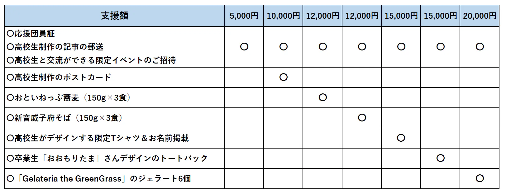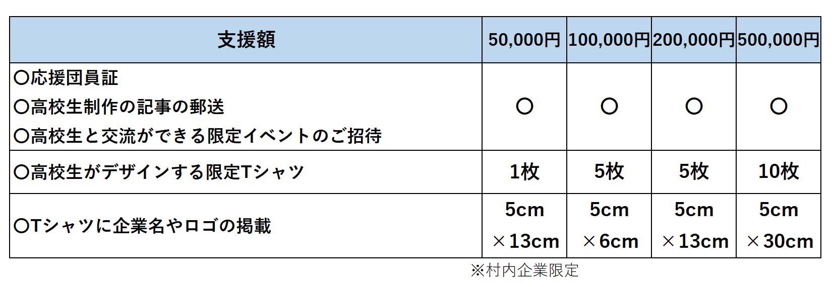 加えて、支援額に応じて、高校生や卒業生の作品や村の特産品などをお贈りさせていただきます。