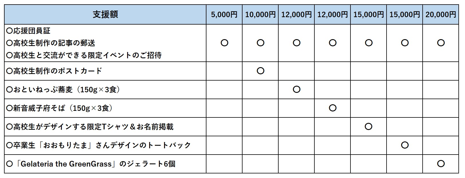 応援いただいた皆様には、応援団員証を作成し、高校生が村の魅力や作品を紹介する記事の郵送(3回以上)、高校生と交流できる応援団限定のイベントへのご招待など、高校や音威子府を感じていただける関わりを作っていきます。