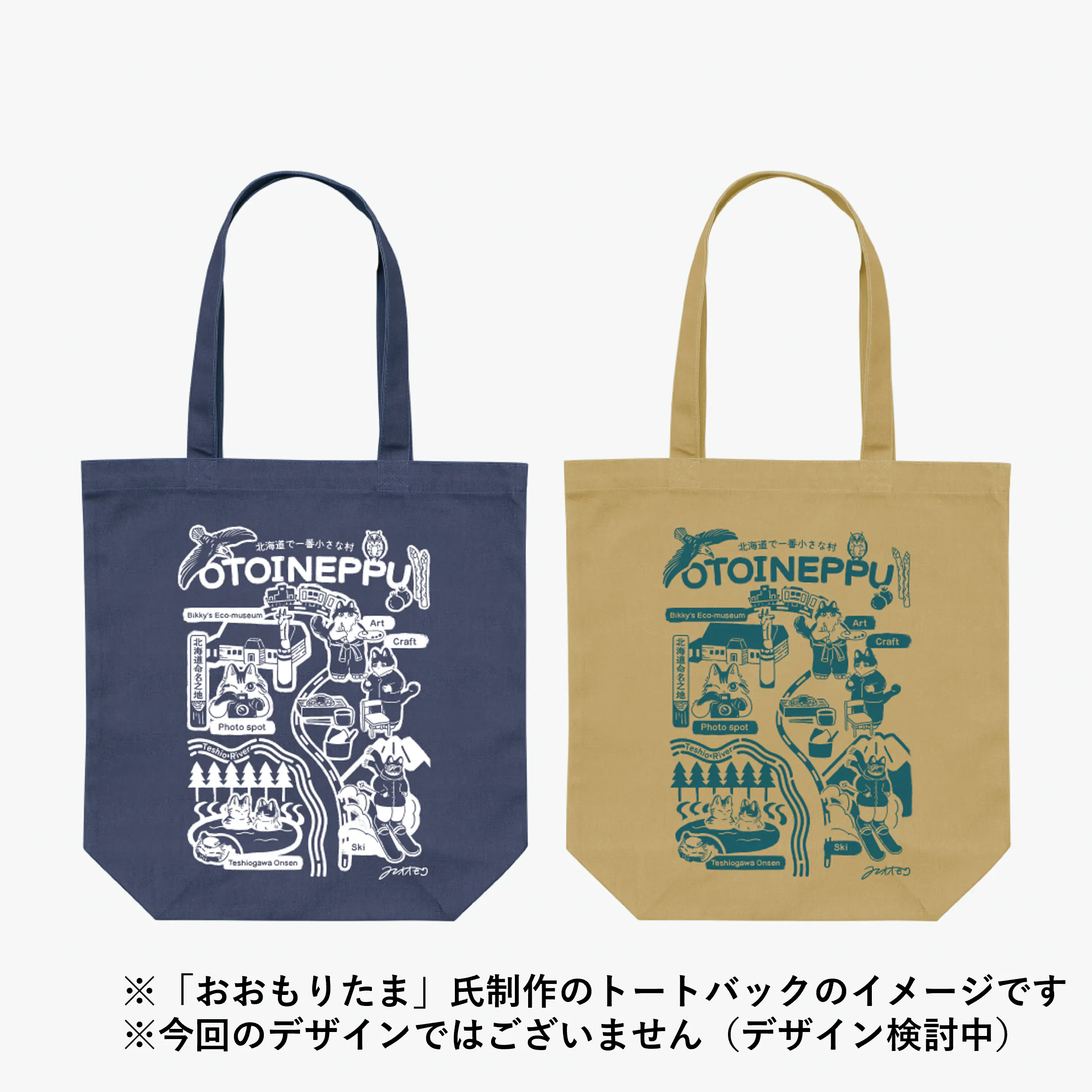 村のアイデンティティである『無人駅』をデザインに盛り込み、村内に設置されたスタンプを押す=村に来ていただく(村の資源再発見の機会を創出する)ことで、唯一無二のトートバッグデザインが完成する仕掛けとなっています。