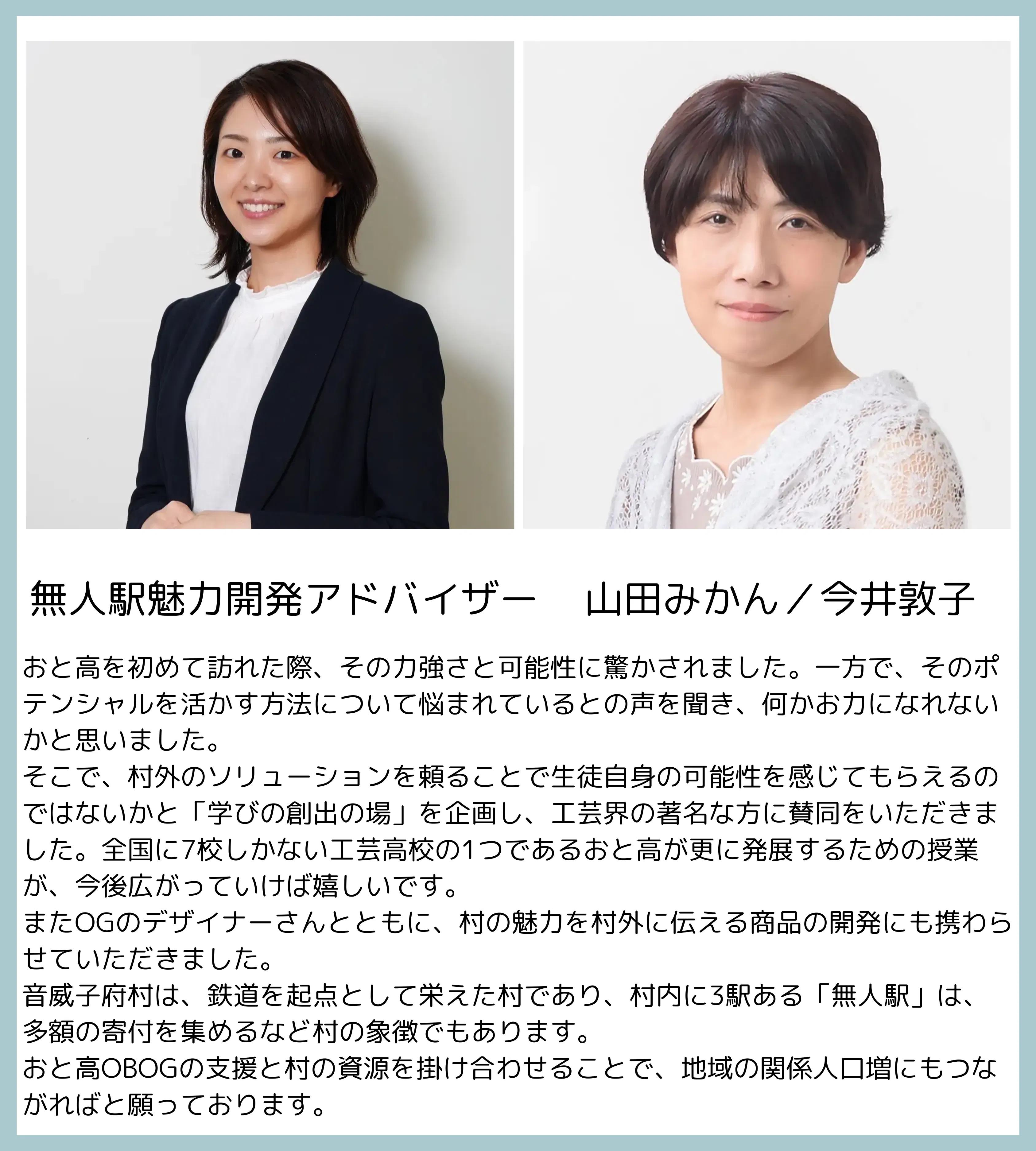 無人駅のような村の資源に目を向ける取り組みを通して、卒業生が村の活性化に協働できるきっかけを作っていきます。
