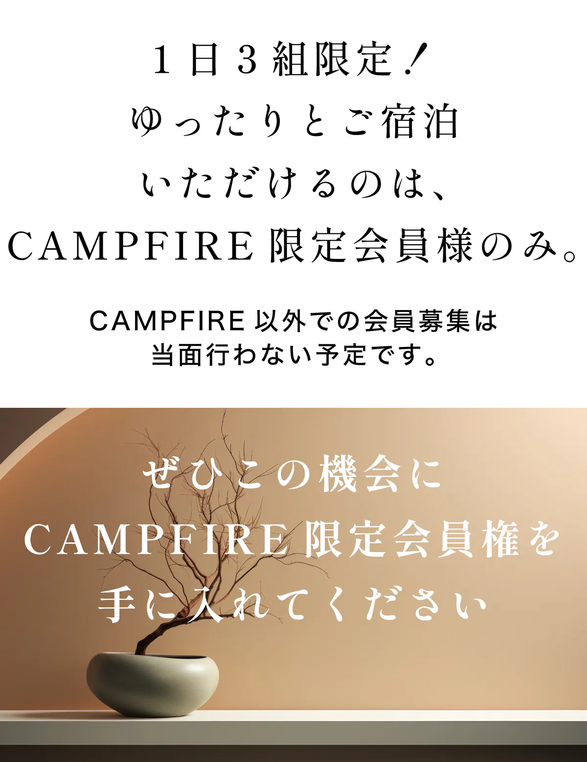 このたび会員様のみご宿泊いただけるCAMPFIRE限定の会員権をご用意致しました!