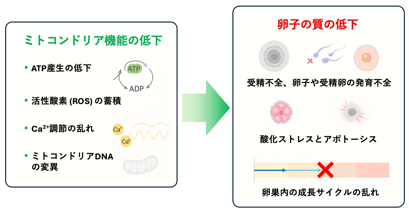 つまり、「卵子そのもの」だけでなく「卵子を育む環境」まで含めて、ミトコンドリアの働きが女性の妊娠力に直結しているのです。