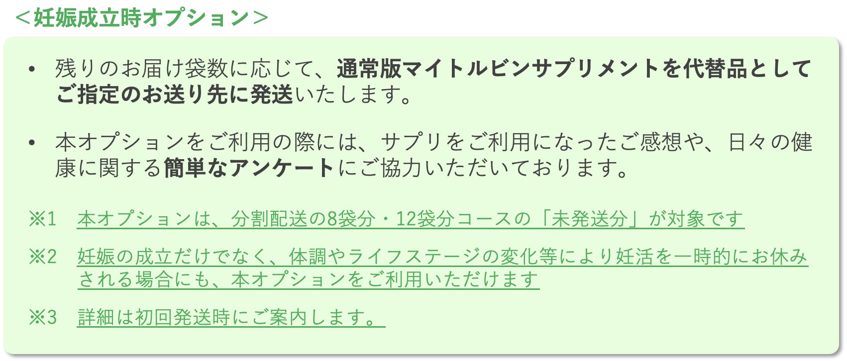 ・妊活が成功しサプリが不要になった場合は、下記の「妊娠成立時オプション」をご利用いただけます。