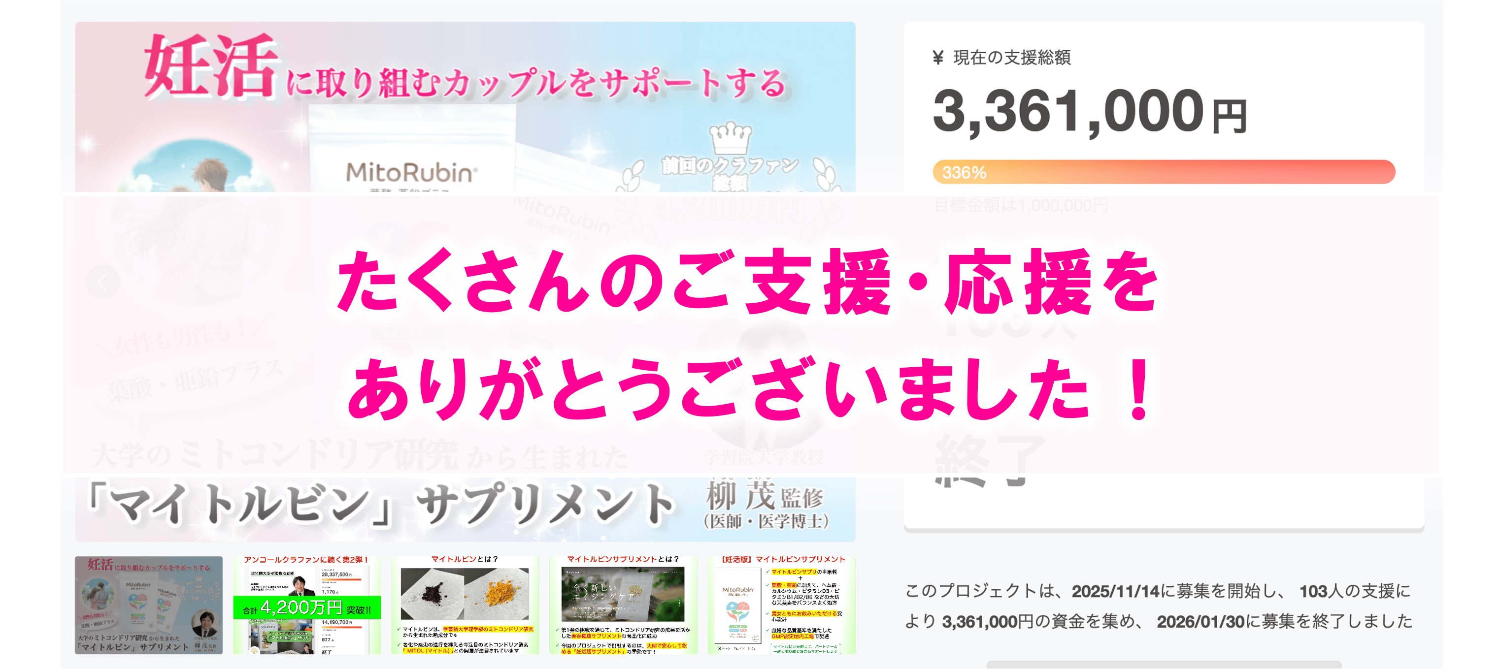 2026/01/31 11:11こんにちは!大学発ベンチャーのマイトジェニックです。妊活サプリ「MitoRubin サプリメント〈葉酸・亜鉛プラス〉」のクラウドファンディング開始から約2ヶ月半、本プロジェクトは、おかげさまで【達成率336%】 にて、無事終了となりました!あらためまして、ご支援・応援をお寄せくださった皆さまに、心より御礼申し上げます。のべ 100名以上 の方からご支援をいただき、大学のミトコンドリア研究から生まれた「マイトルビン」の可能性、そして、エイジングケアや、妊活に取り組む男女の栄養サポート という取り組みに、多くの共感をお寄せいただけたことを、チーム一同とても嬉しく感じております。■ 新サプリメントのお届けについて新サプリメントの製造につきましては、2月中のお届け を目指して、国内の FSSC22000登録 / GMP認定工場にて、現在、鋭意製造中 です。今後の進捗は、本活動報告、またはご支援者様向けの CAMPFIREメッセージ を通じて、随時お知らせしてまいります。エイジングケア版をご支援いただいた皆さまへのお届け時期 につきましても、同様に、別途あらためてご案内いたします。■ 新サプリメントの一般販売について本プロジェクトをきっかけに新製品を知ってくださり、「一般販売はいつからですか?」というお問い合わせも、多数いただいております。新製品の一般販売につきましては、ご支援者の皆さまへの初回発送を完了した後、MitoRubin® 公式ECサイトにて開始予定 です。販売開始時期が決まり次第、公式サイト等を通じてあらためてご案内いたします。◇ ◇ ◇最後になりますが、本プロジェクトを通じていただいた皆さまのご支援・応援は、研究・製品づくり、そして今後の情報発信に取り組む私たちにとって、大きな励みとなっています。この挑戦は、これで終わりではありません。「ミトコンドリアのケアが、私たちの生活の中で、当たり前になる世界」を目指して、引き続き、研究と開発を着実に進めてまいります。これからも、ミトコンドリア研究の成果を、皆さまの日々の健康に、どうつなげていけるか?という視点を大切にしながら、一歩ずつ歩みを進めてまいります。引き続き、温かく見守っていただけましたら幸いです。本当にありがとうございました! もっと見る