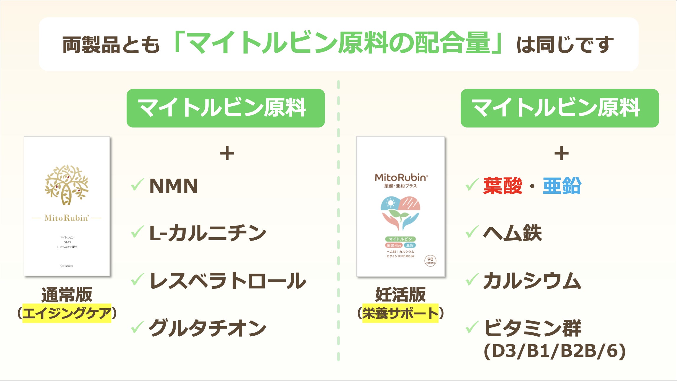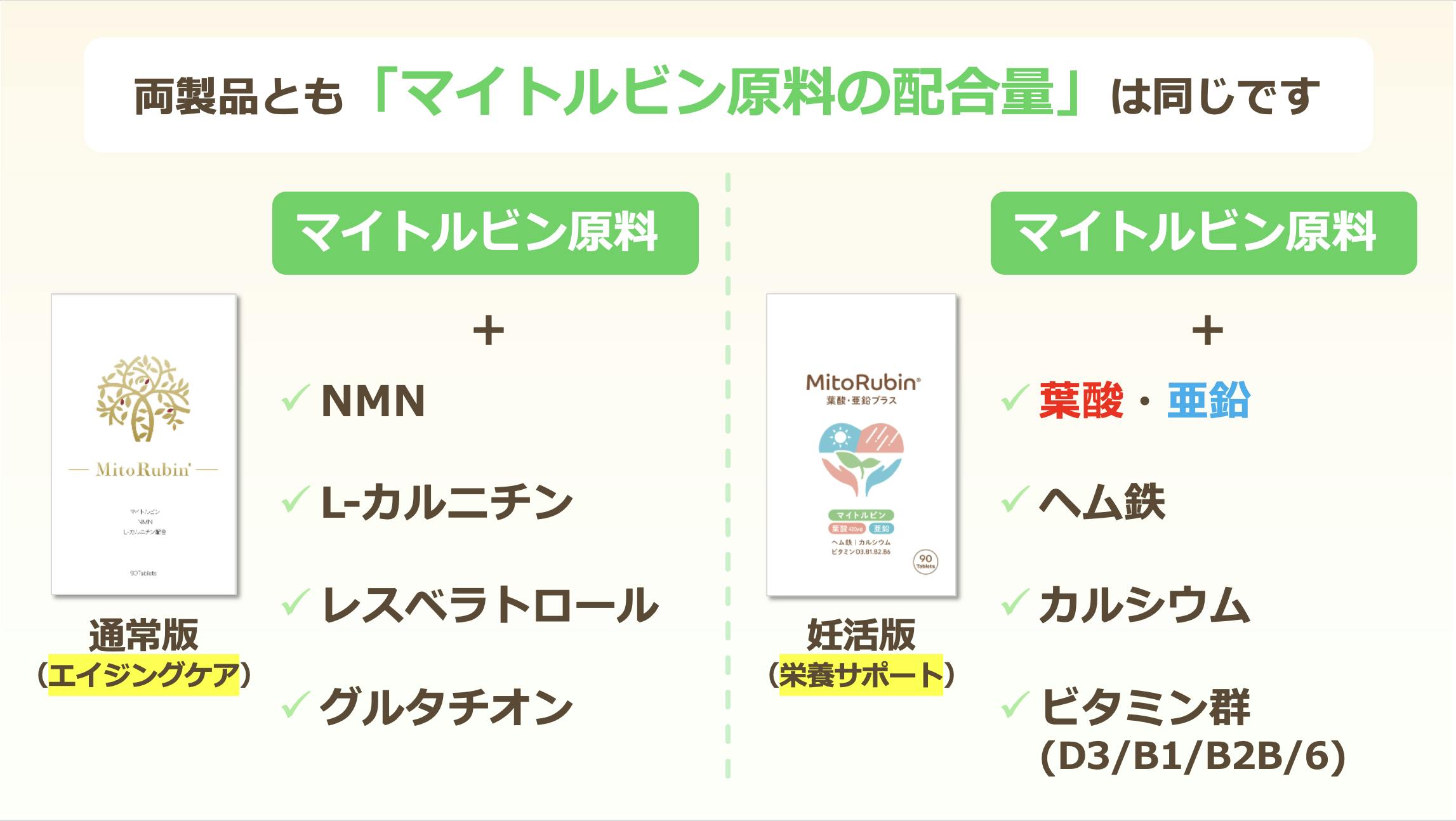 Q1.「通常版(エイジングケア版)と今回の妊活版サプリで、マイトルビン量は違うのですか?」
