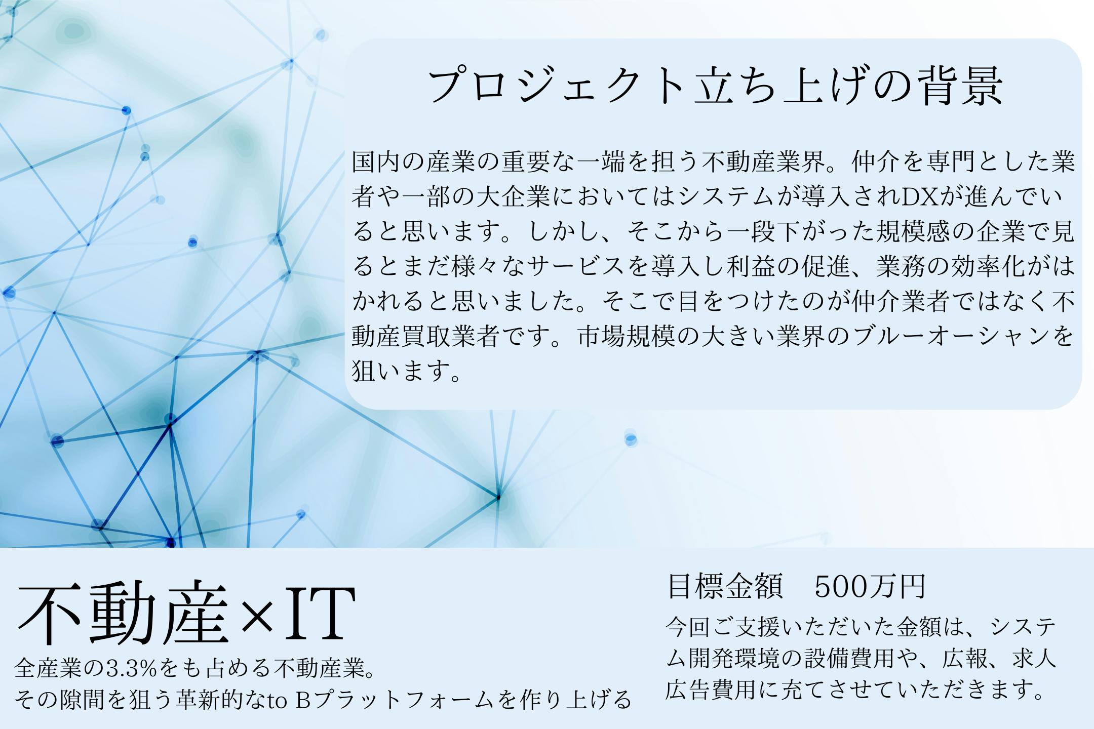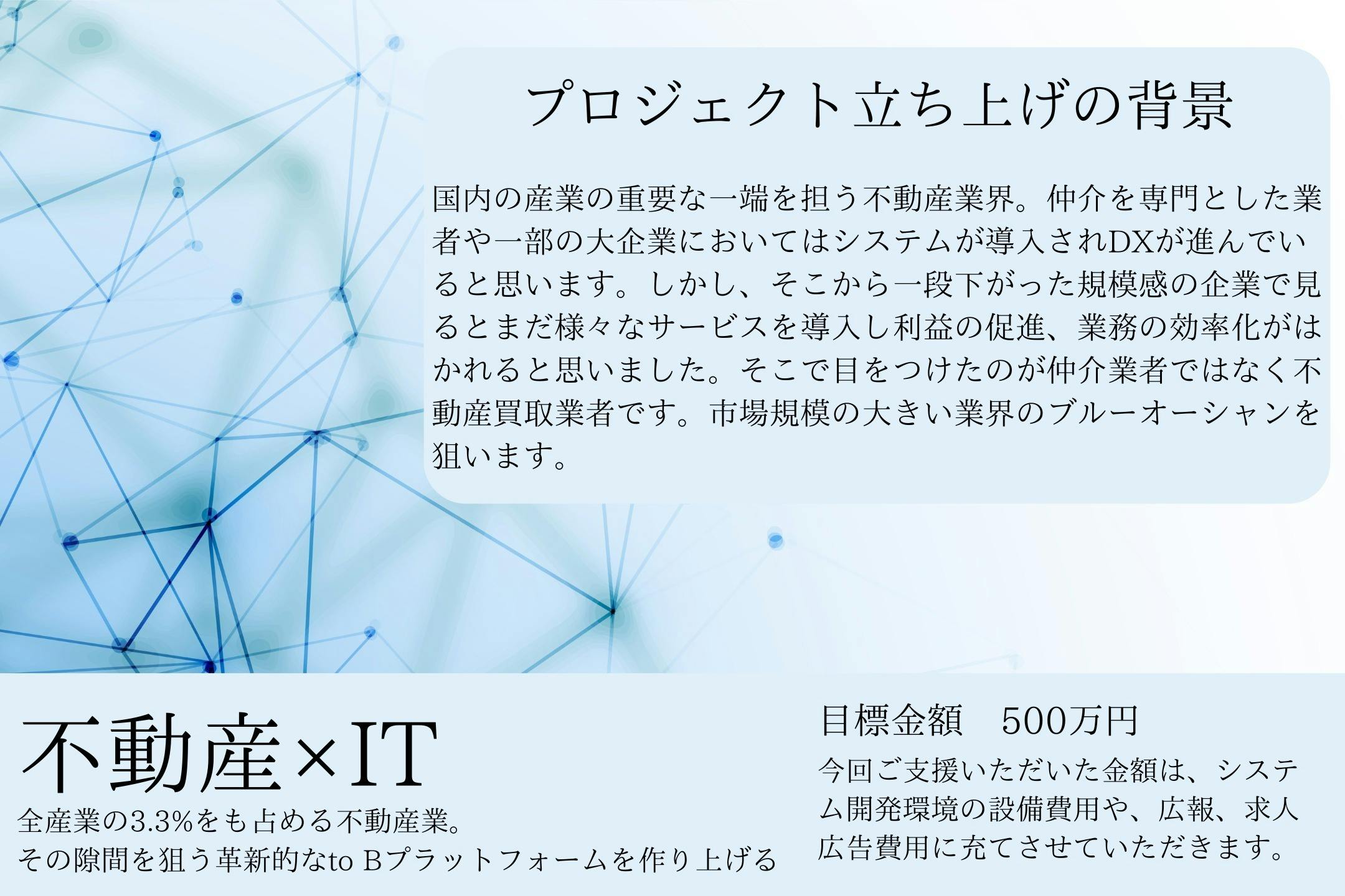不動産最大手の仲介を専門とした業者や一部の大企業においては、システムが導入されDXが進んでいると思います。しかし、そこから一段下がった規模感の企業で見るとまだ様々なサービスを導入し利益の促進、業務の効率化がはかれると思いました。そこで目をつけたのが仲介業者ではなく不動産買取業者です。主なサービス内容は盗作防止のためこの場では申し上げられませんが、不動産を仲介するのではなく自社で買取をするような業者に向けたプラットフォームを考えています。市場規模の大きい業界のブルーオーシャンを狙います。