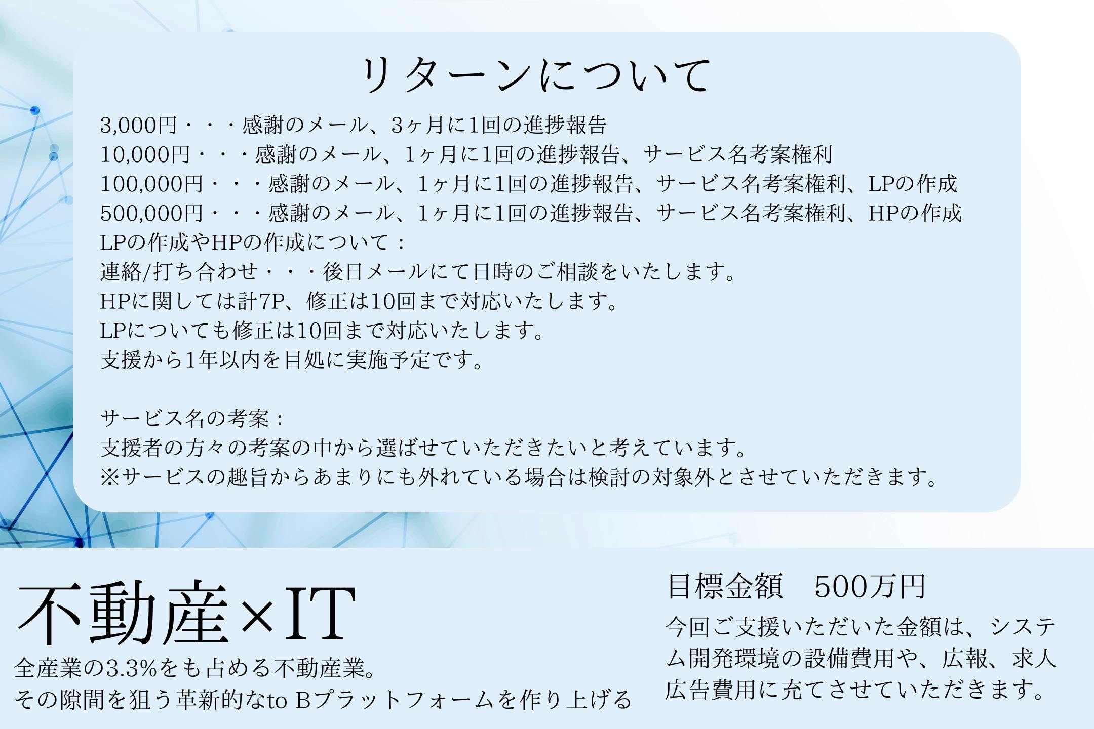 まだ企画段階でプロジェクトを進めていくチームの求人や、そのほか全てがこれからという段階ですが、ここで集まった支援金をもとに、これからの日本のGDPの向上につながるようなベンチャーの創設を夢見ています。起業から倒産までの経験を活かしこのプロジェクトの成功へ日々精進いたします。