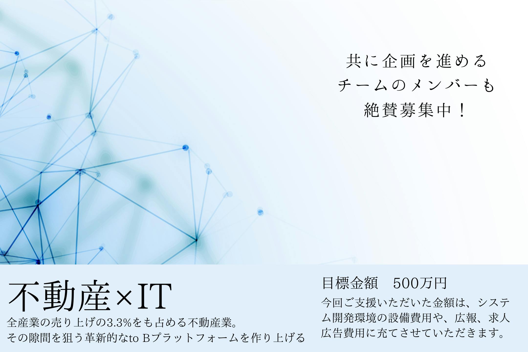 初期部分の事業計画が見えてきたのでクラウドファンディングにて第一フェーズの資金調達を開始させていただきます。この資金をもとに法人の立ち上げ、プロジェクトメンバーの募集、プロジェクトの細案の企画に入ります。