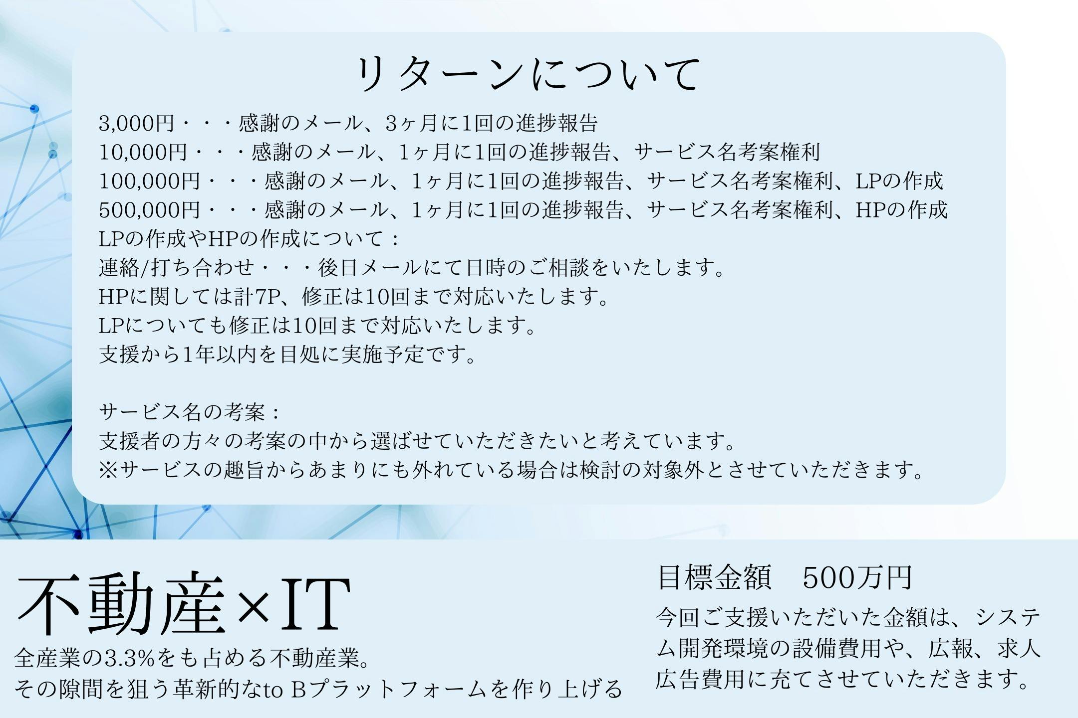 500,000円・・・感謝のメール、1ヶ月に1回の進捗報告、サービス名考案権利、HPの作成