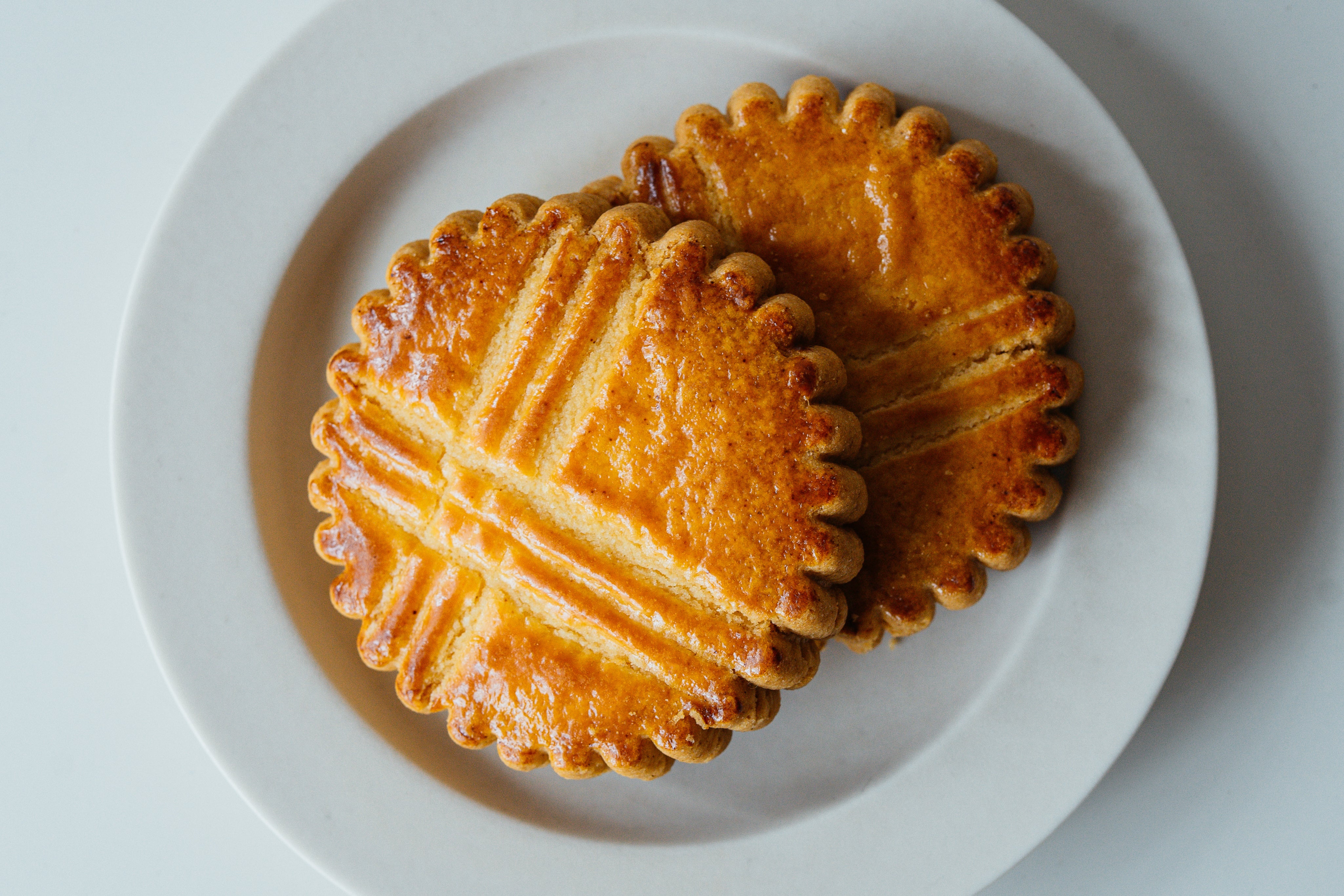 香り豊かなフランス産の発酵バターをたっぷり使った、極厚焼きのリッチなバターガレットです。厚さ約2.5cmと、OYATSUYA SUN史上最も厚焼きのクッキーとなります。厚さにこだわったのは、素材の良さを感じていただきたいから。ガレット=フランスの伝統的な厚焼きクッキーのことで(正式にはガレット・ブルトンヌ)、小麦粉、バター、卵、砂糖からなる非常にシンプルなクッキーです。OYATSUYA SUNでは今回、ほろほろと口溶けの良いフランス産の小麦からなる豊かな風味の小麦粉、同じくフランス産の深いコクを持つ発酵バターをベースにレシピを熟考。素材の良さを生かすようにじっくりと焼き上げました。