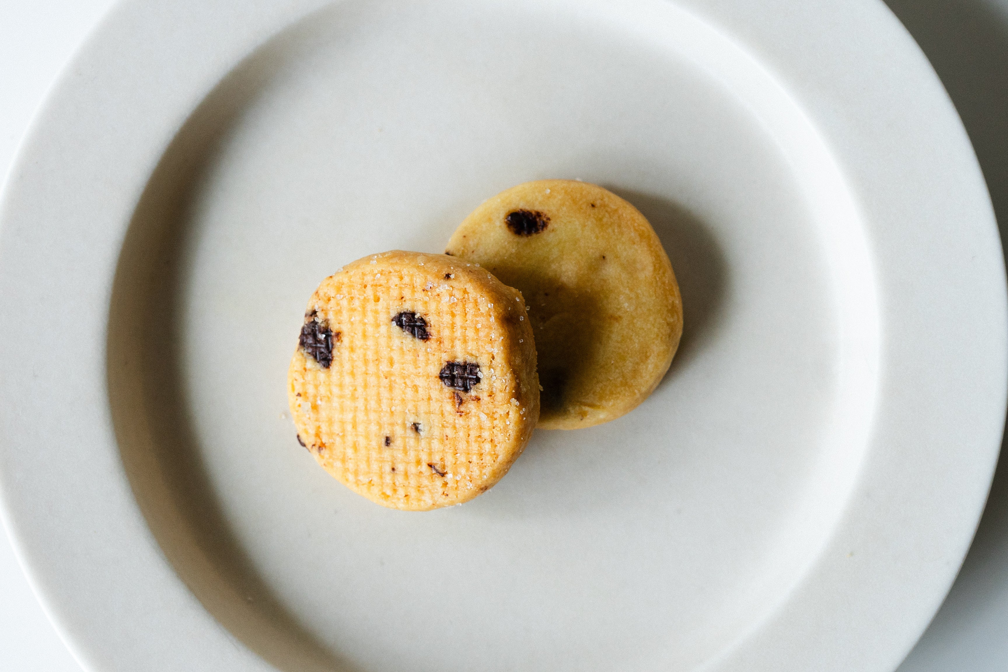 仏カカオバリー社のチョコレートチップと、ゲラントの塩を使ったディアマンクッキーです。こちらのクッキーは、もともとイベントの時など特別な時に作っていたものを、材料を見直し、歯触りや食感を考え厚さを1mm薄くして、最高のクッキー缶にふさわしい状態へとリニューアルしました。また、焼く時に天板の上に敷くシートにも工夫を凝らし、サクッと焼き上がるようにしました。上の写真左側のクッキーは裏面を向いているのですが、この格子状の模様がおいしさの秘密です。