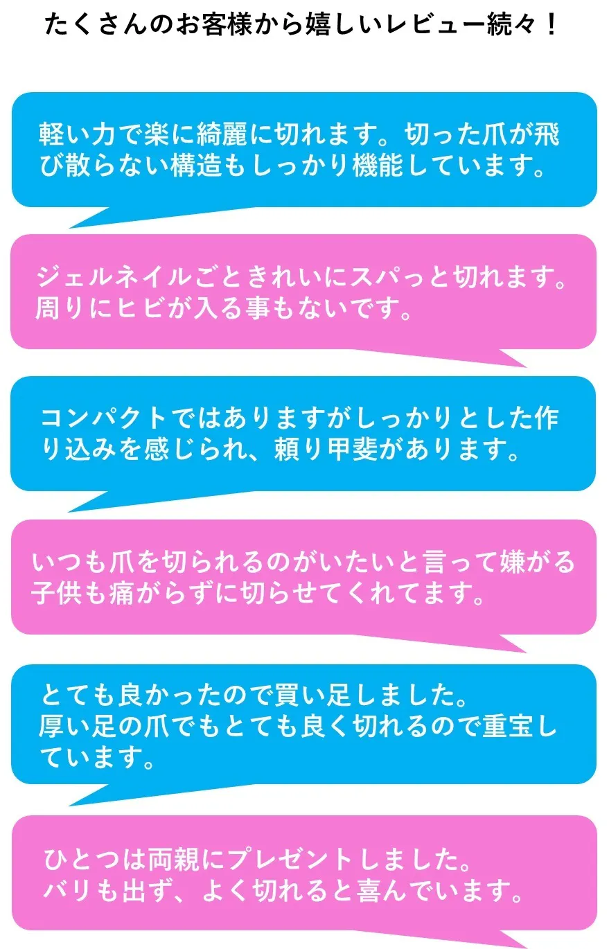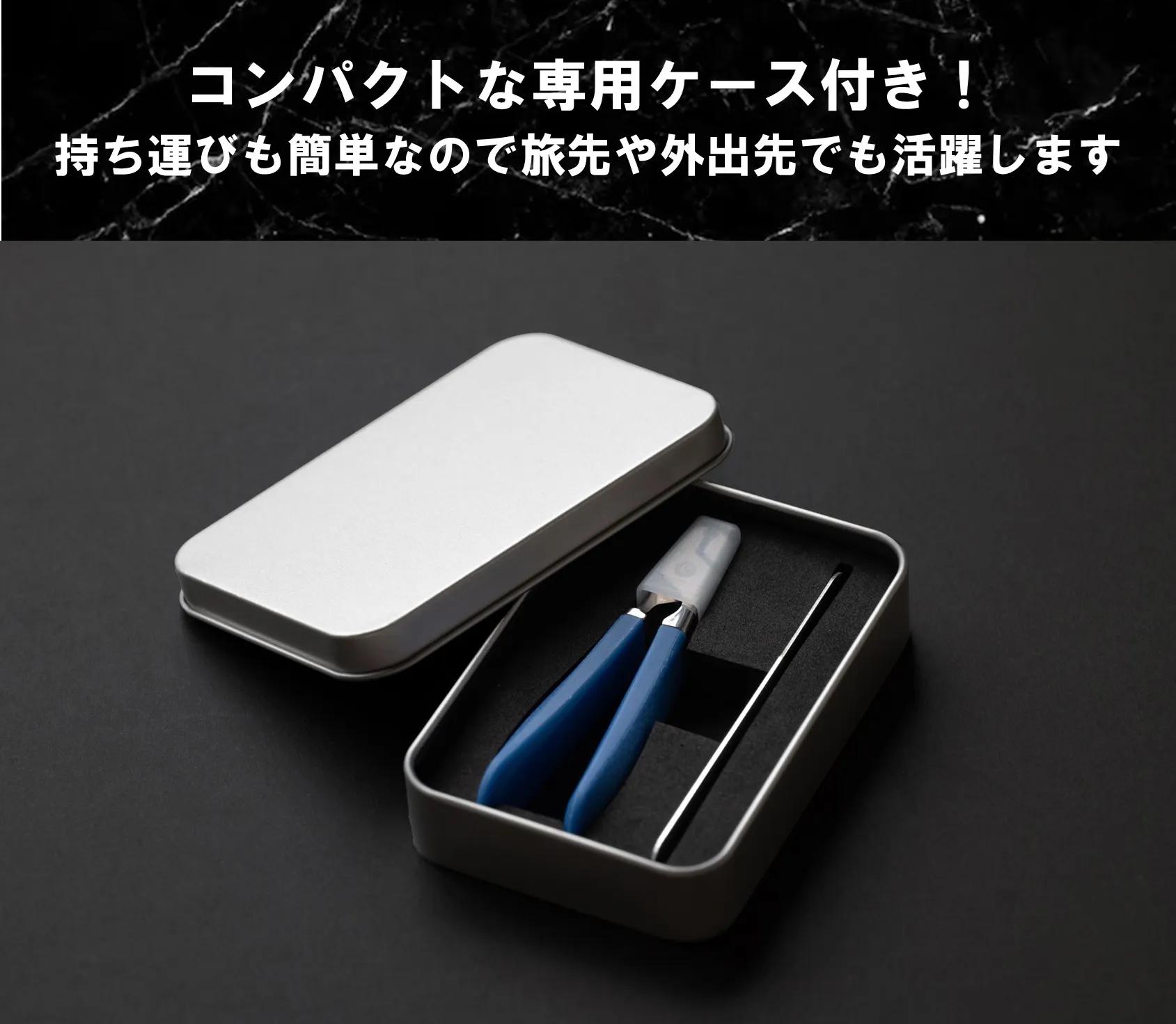 革新的なデザインと卓越した機能性により、通常の爪切りでは難しかったケアを可能にする新しい爪切りです。爪が飛び散ることなく、バリができにくく、分厚い爪でもサクッと切れるのが最大の特徴です。