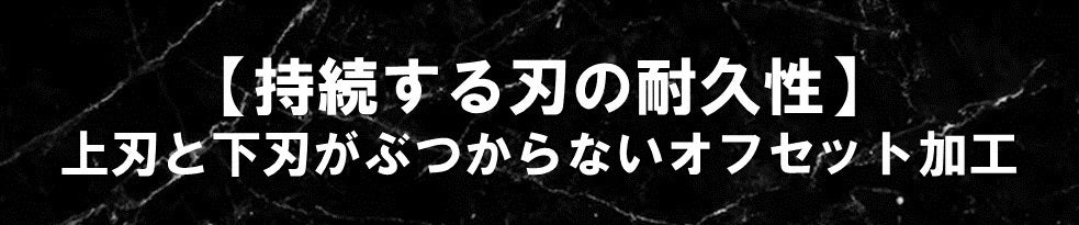 刃には独自のオフセット加工を施しています。上刃と下刃をあえて0.02mmずらすことで、刃が痛みにくくなり、耐久性が飛躍的に向上します。これにより、長期間にわたり優れた切れ味が持続します。