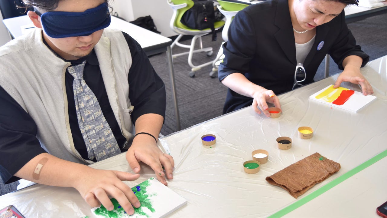 近畿大学にまーちゃんに来ていただき、触覚、嗅覚を駆使して描く制作プロセスを体験しました。自分が好きな香りを楽しみ、手で混ぜ、キャンバスに描く。ワークショップ参加者にとっては、目を開けると自分が想像する色味とのギャップが面白い作品となりました。