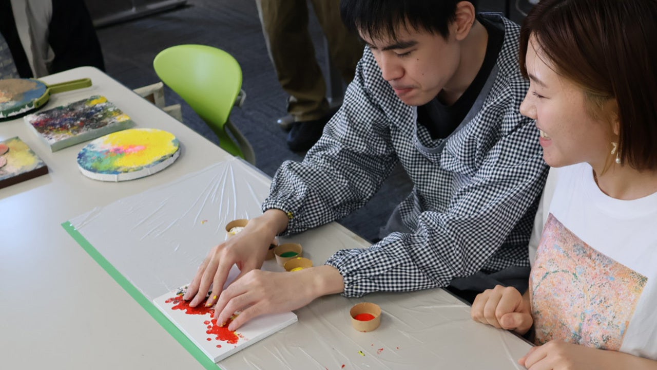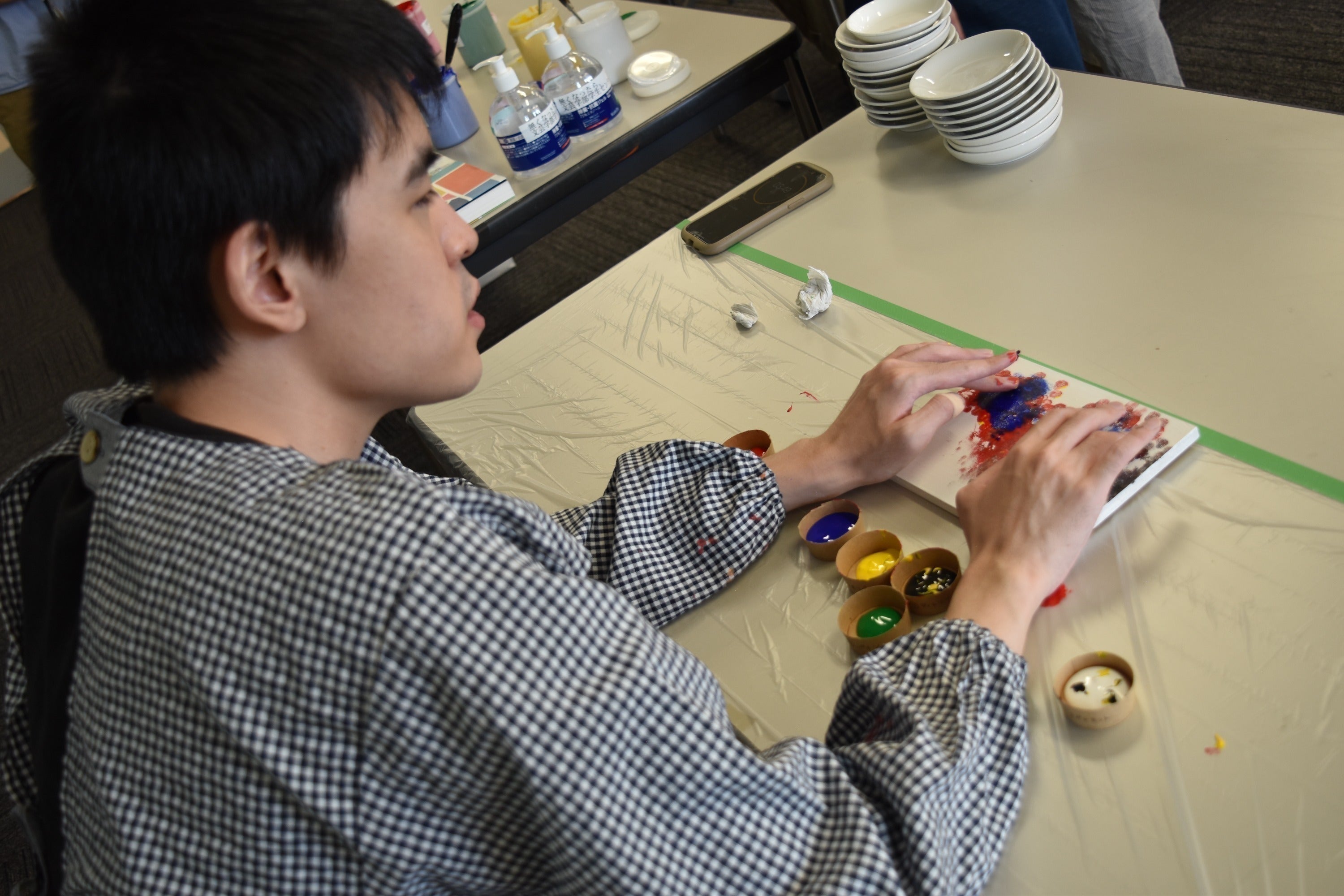 【嗅覚×触覚】アクリル絵具には独特の触り心地があるため、視覚障がいのある方の創作にも適しています。創作をサポートする周囲の人々との会話も弾みます。