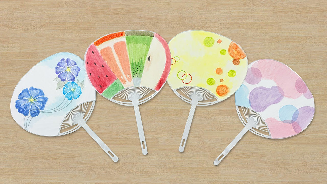白いうちわや扇子をキャンバスに香りをイメージしペイントします。