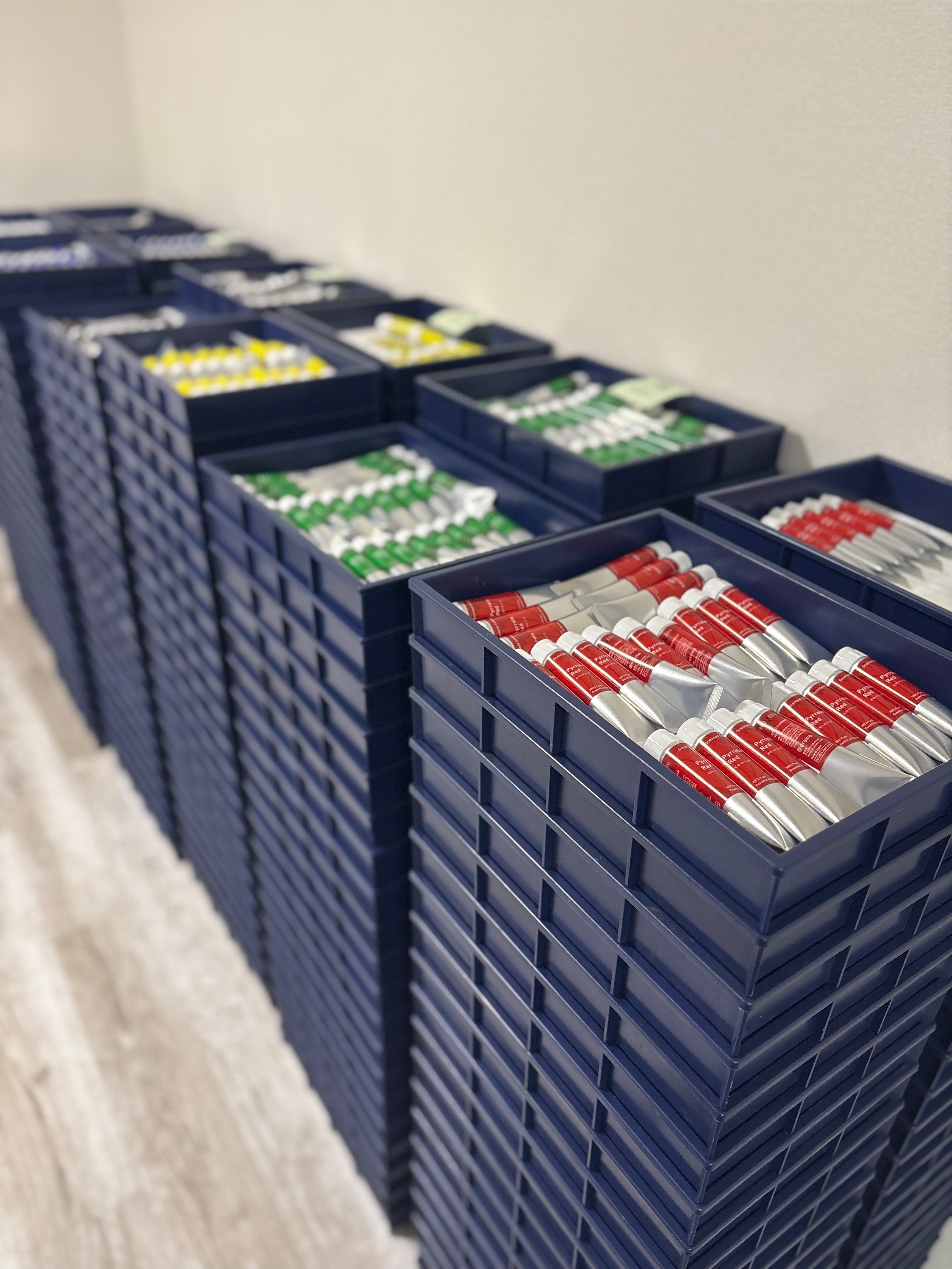 色ごとにキレイに並べられたたくさんの絵具、かなりの重量です。。