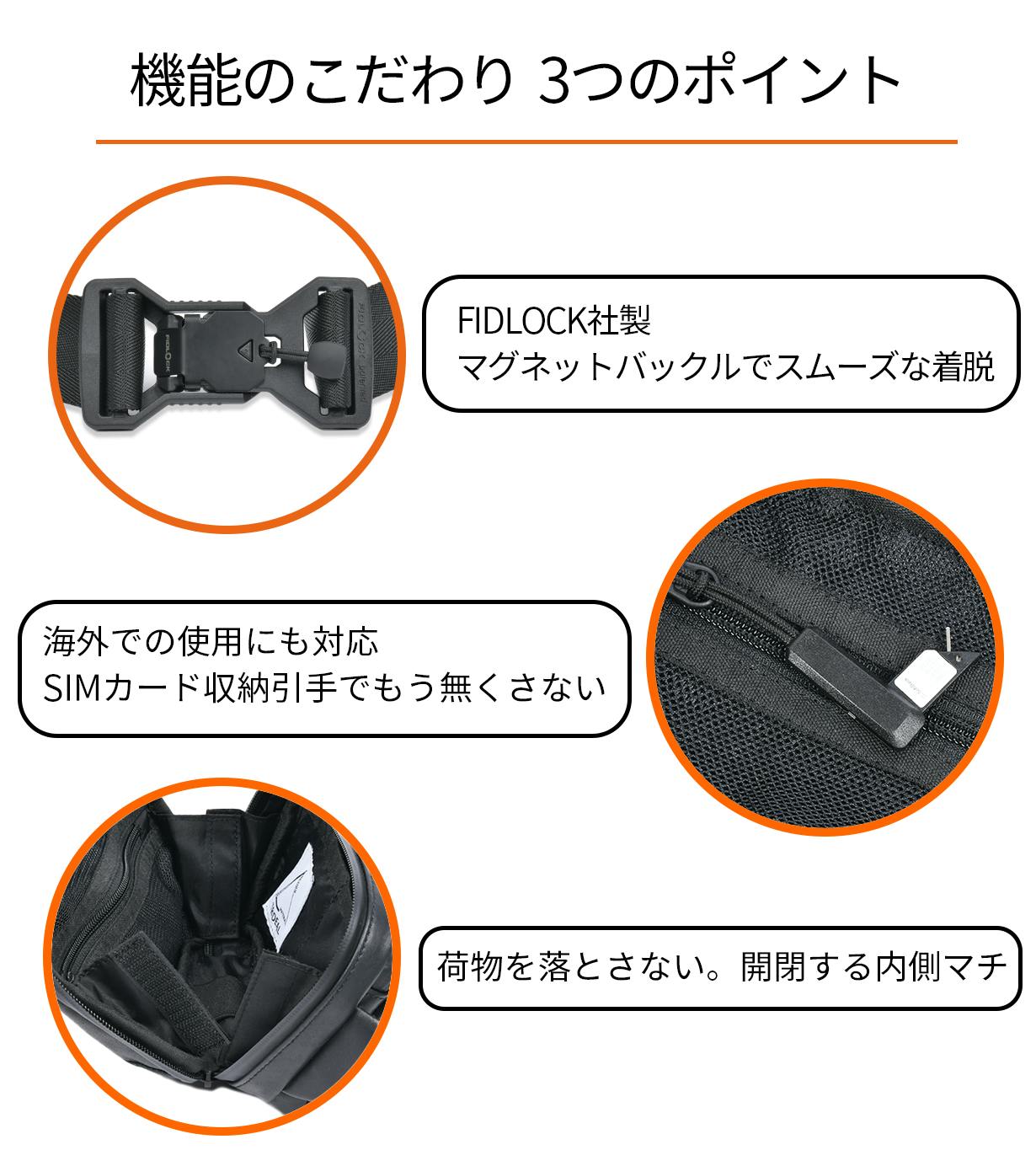 ショルダーベルトには、FIDLOCKのマグネットバックルを採用しています。